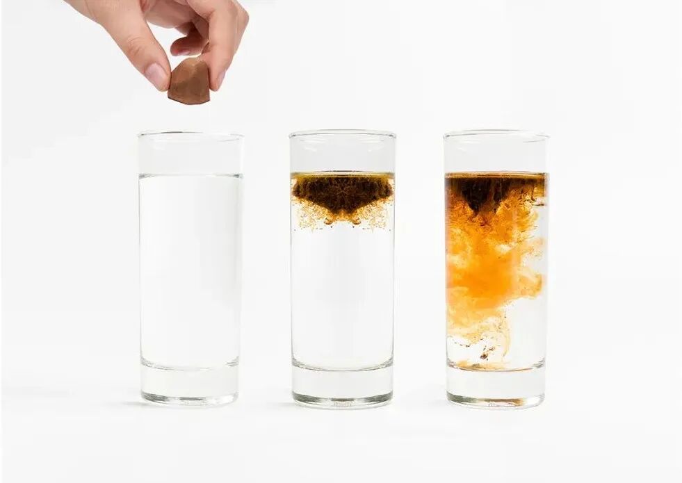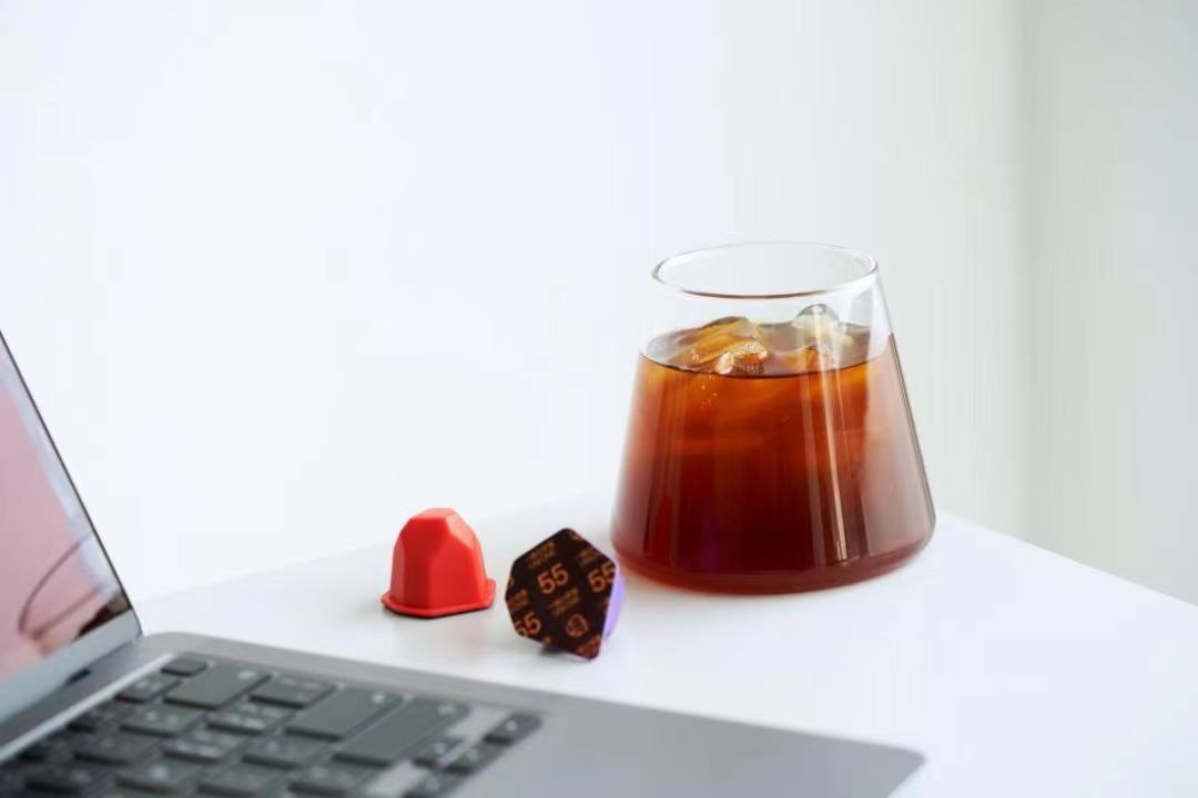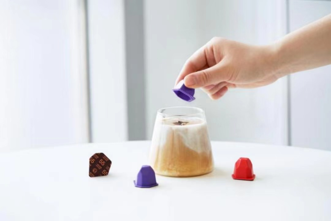 它融化的过程就像一座小冰川,悬浮在水面上,边溶解边下沉,趣味感十足。咖啡下肚前,用奇妙的视觉感打开想象,哪怕是3秒完成的冲泡过程,依旧有着做手冲般的仪式感和乐趣。
