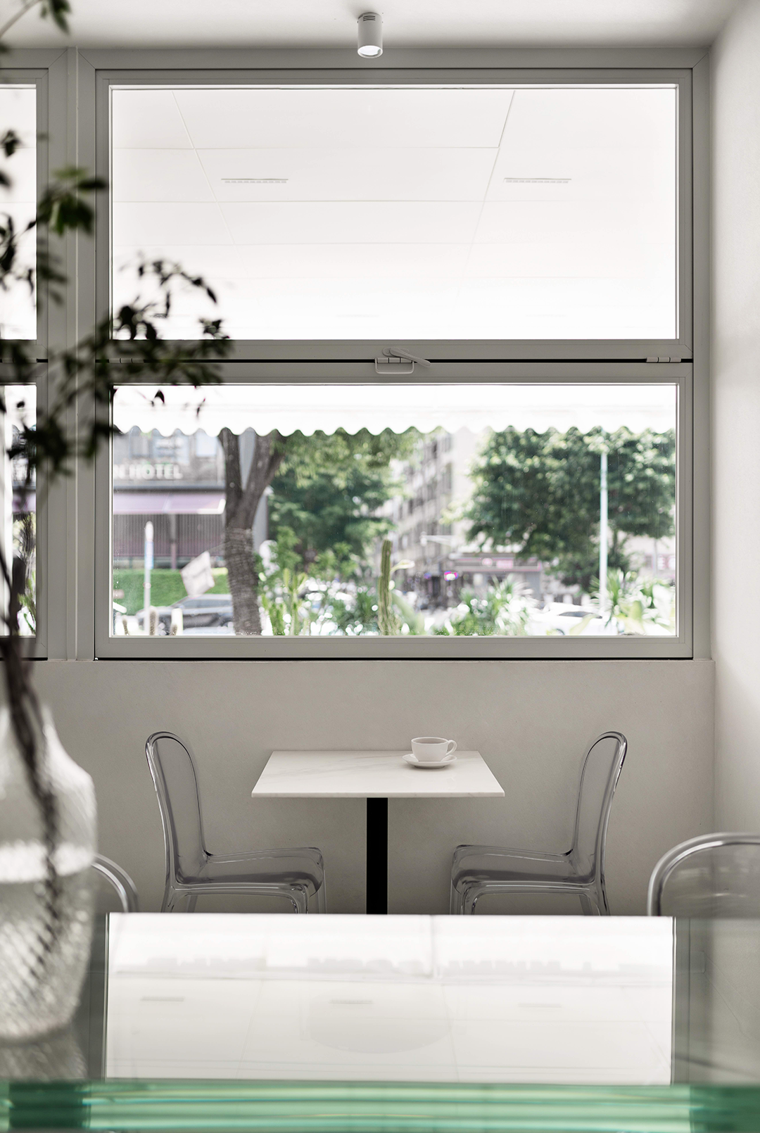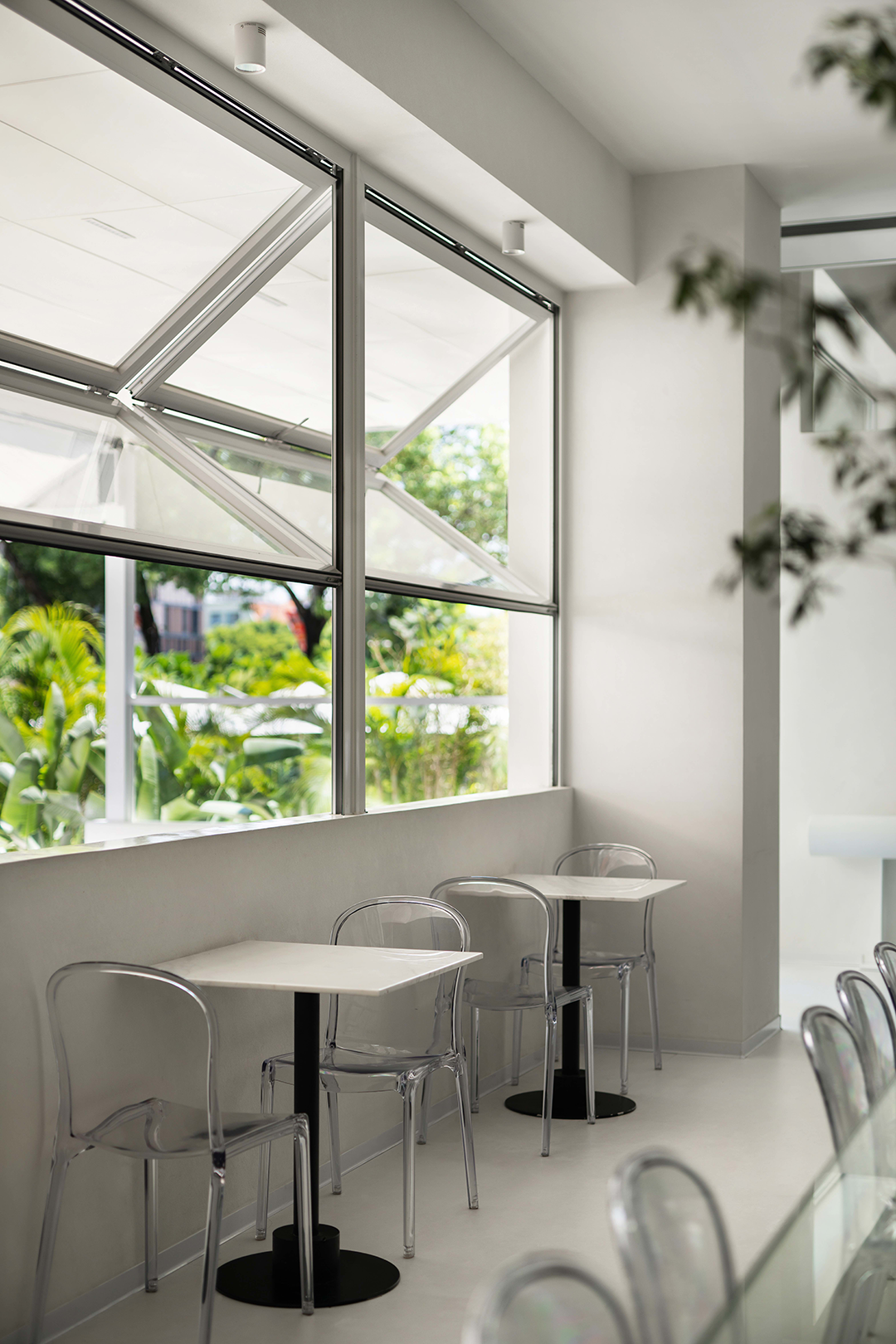 通过纵向开启的窗打通室内外空间的联通,这种开放性的设置,消解了体验边界的限制。不但可以让在外的行人直观的参与店中的发生场,同时能让坐于店内客人联通往来的现实世界。