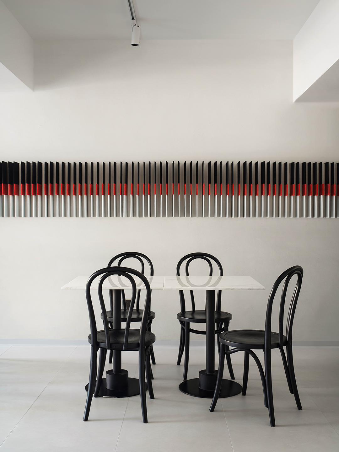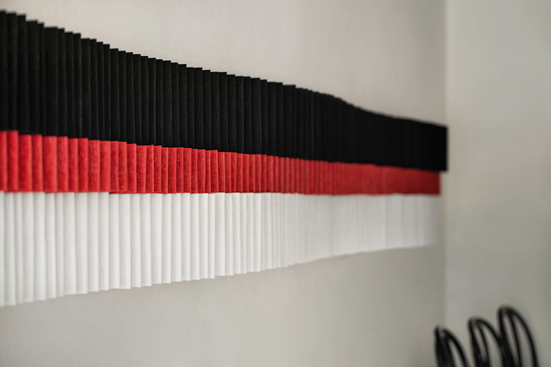 在二层空间的墙面,设计师将序列分布的艺术装饰充分植入,在纯净的白色界面中加入了红与黑的色彩对比,强烈的情绪激荡为平实的灵感场域注入了活力律动。