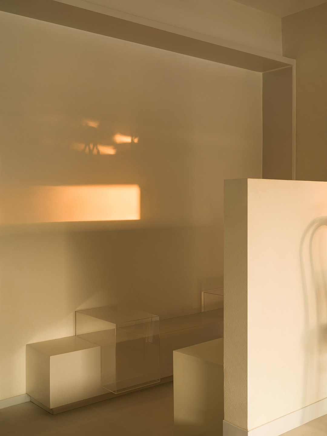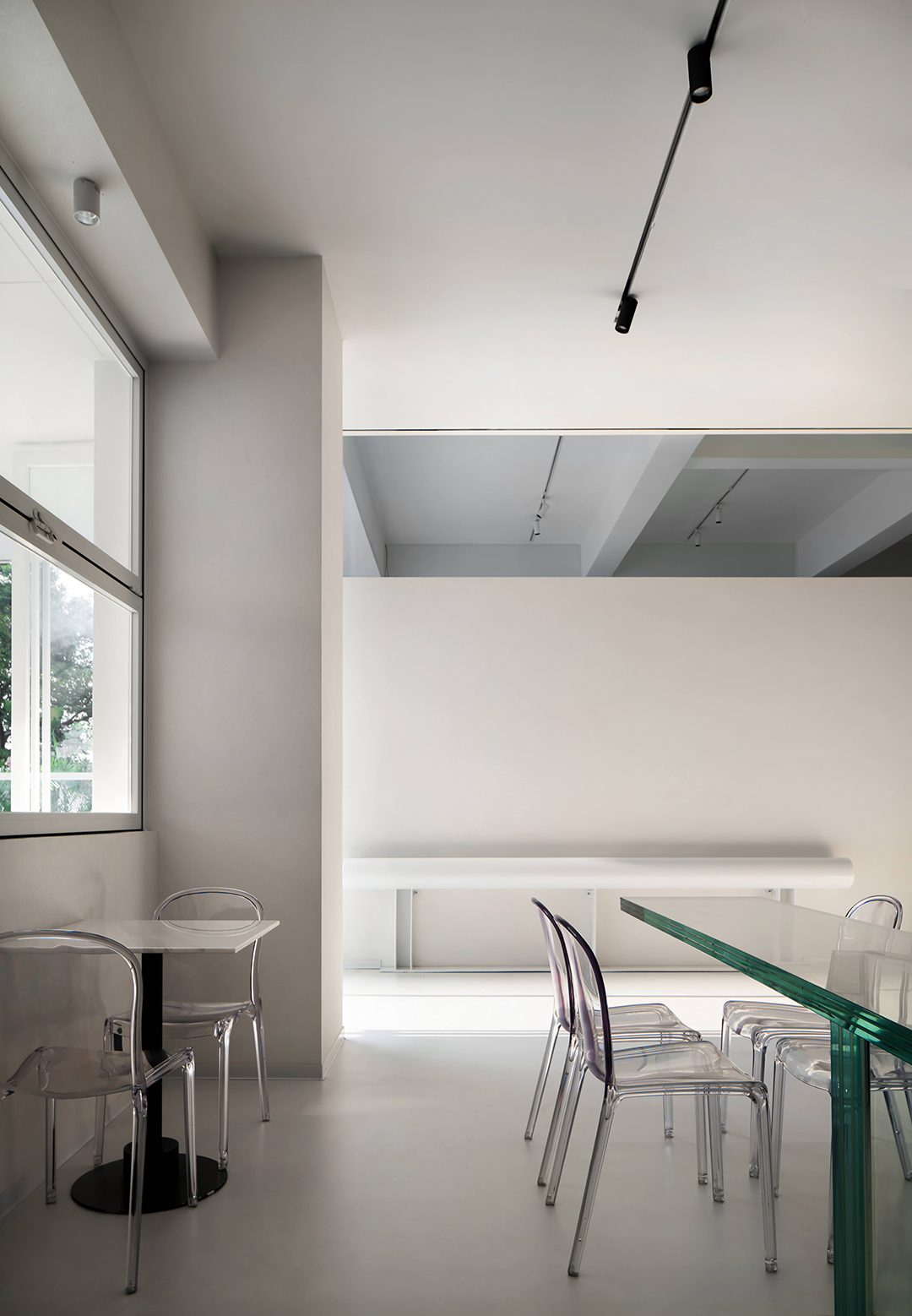 室内空间以大面积的白色充斥两个方盒空间的嵌套结合关系,并通过高差打造垂直纬度的丰富体验。