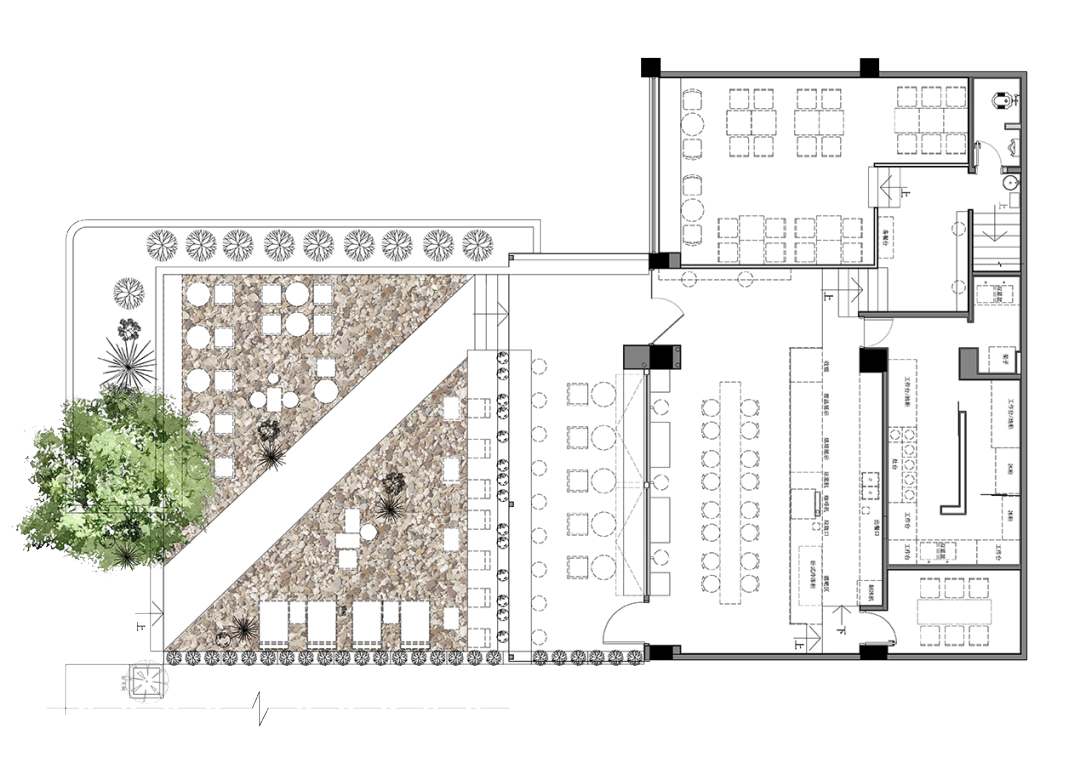 以步道斜角切分方形庭院的平面格局,辅以袒露大地肌理的植物与沙砾铺陈,在仪式感与功能性中寻找平衡点。