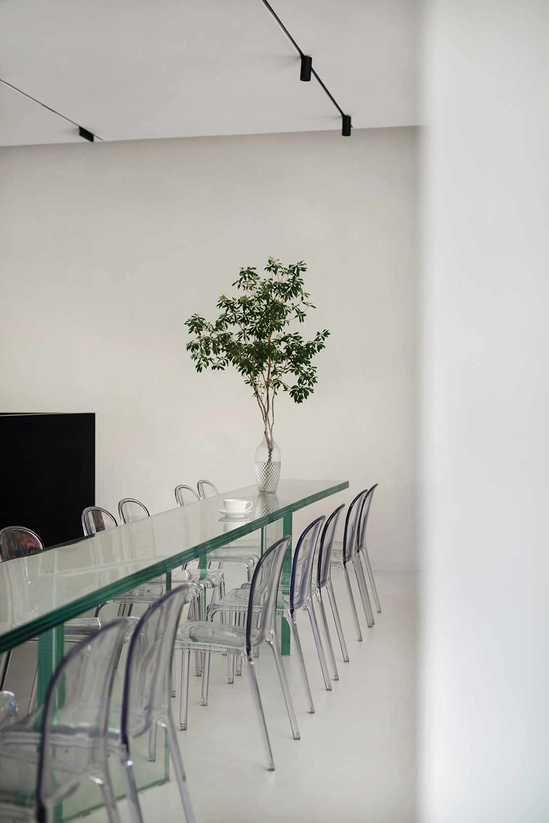 主空间中央的玻璃长桌,通体透明的硬朗形体透露着工业时代的冷峻与严谨,而亚克力椅子的柔和曲线中和了其中的疏离,使得人们共处方式更加开放多元。人们可以在这里视频会议、活动交流,充分表达自我,联通外部世界。