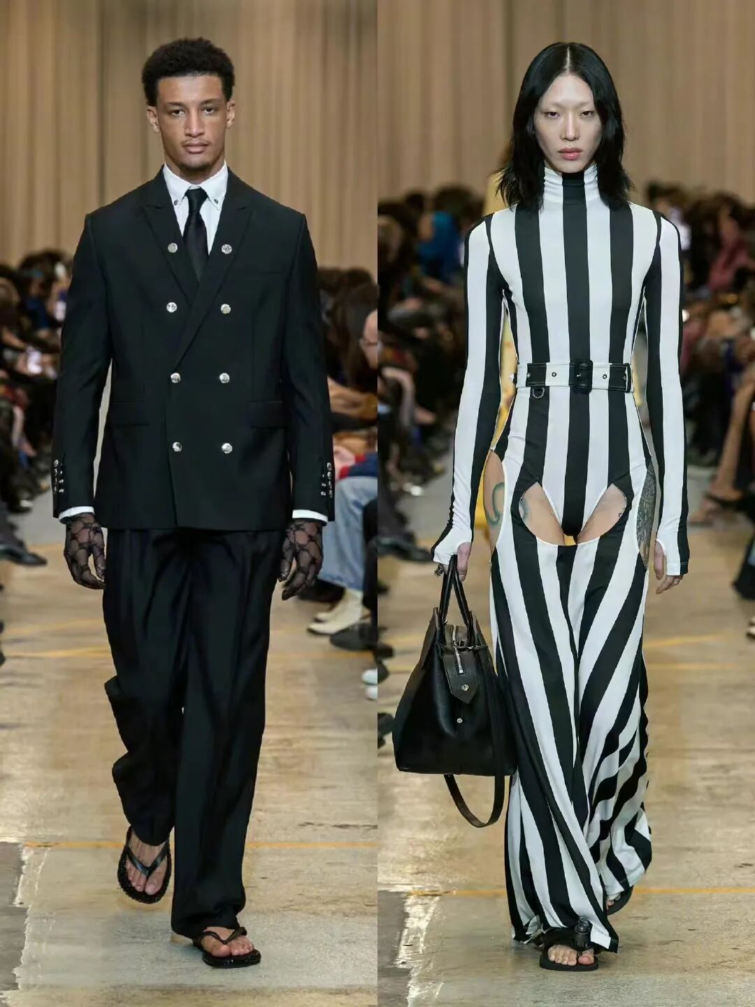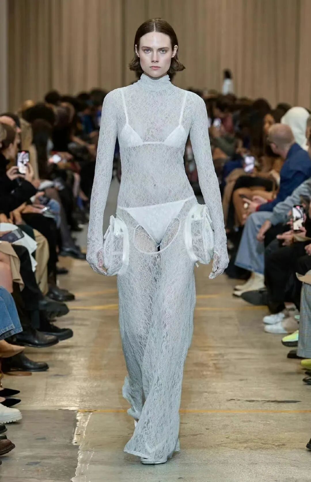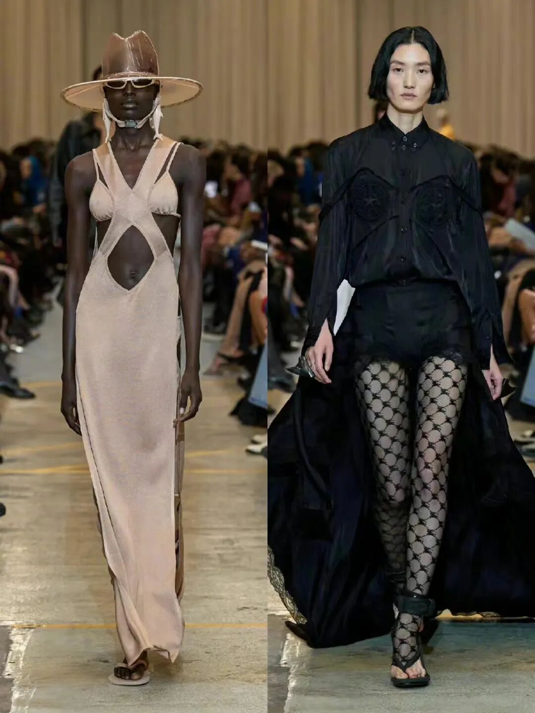 灵感确实很好,但是比基尼、泳衣、人字拖,同时配合着蕾丝、网眼、穿孔、哥特式字体等哥特风标志性元素,以及别出心裁的开洞,这屎尿不及的镂空,让网友直呼:对不起,是我又看不懂时尚了......