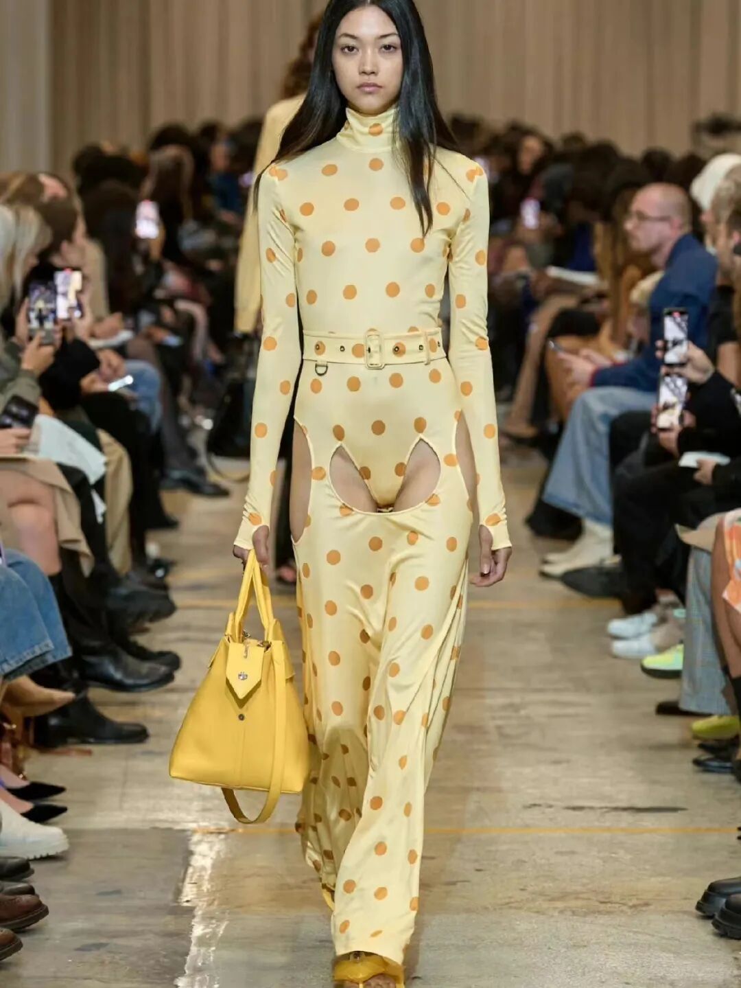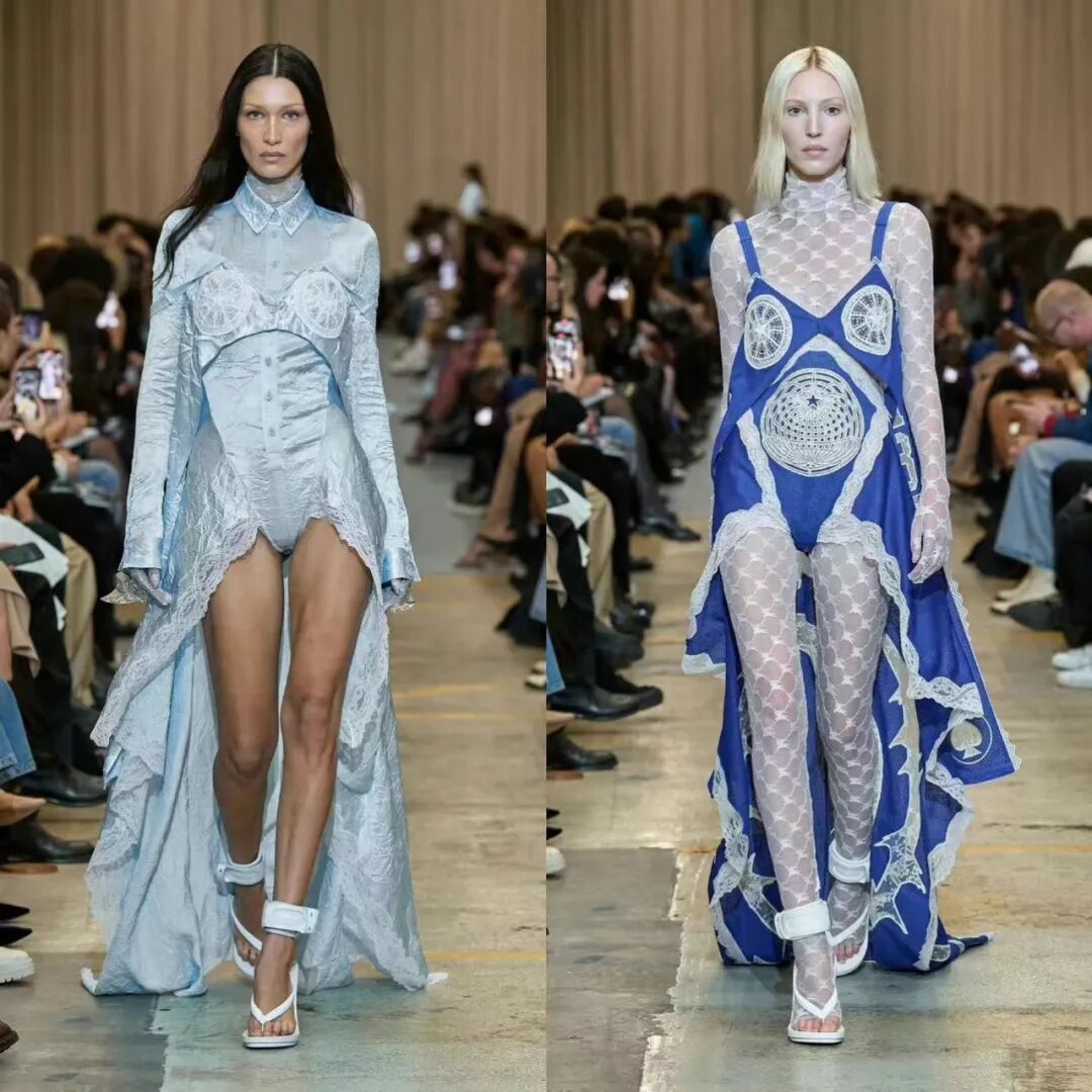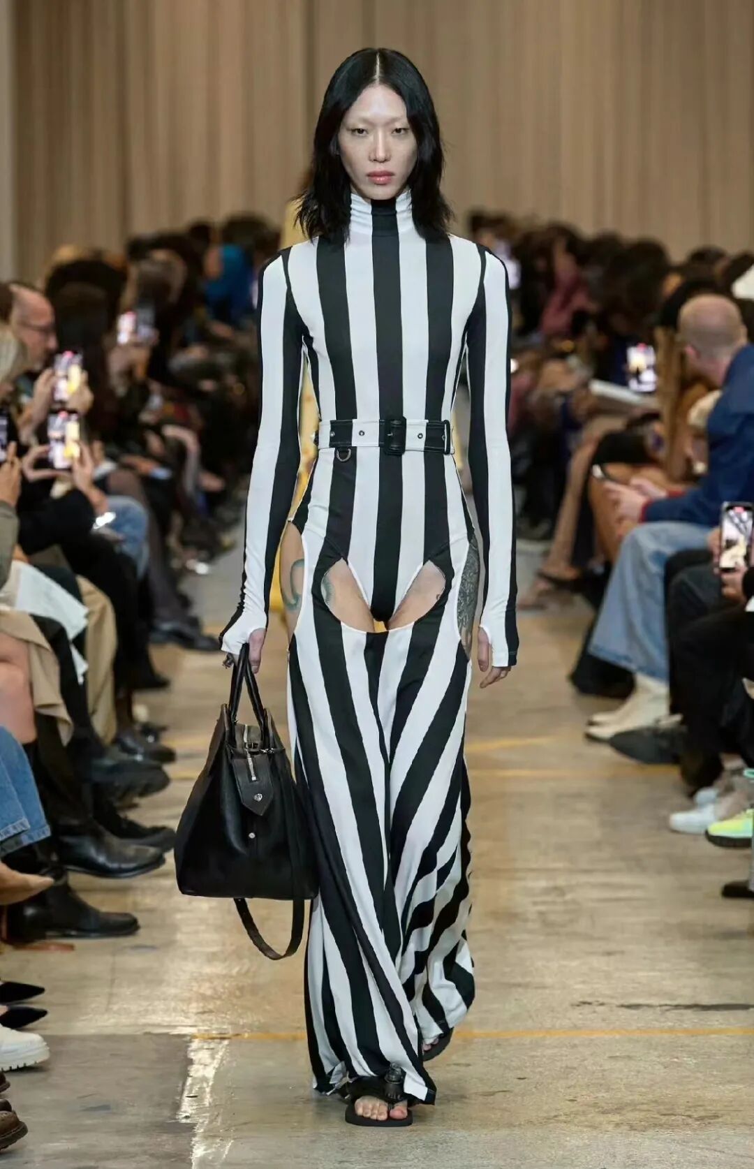 灵感确实很好,但是比基尼、泳衣、人字拖,同时配合着蕾丝、网眼、穿孔、哥特式字体等哥特风标志性元素,以及别出心裁的开洞,这屎尿不及的镂空,让网友直呼:对不起,是我又看不懂时尚了......