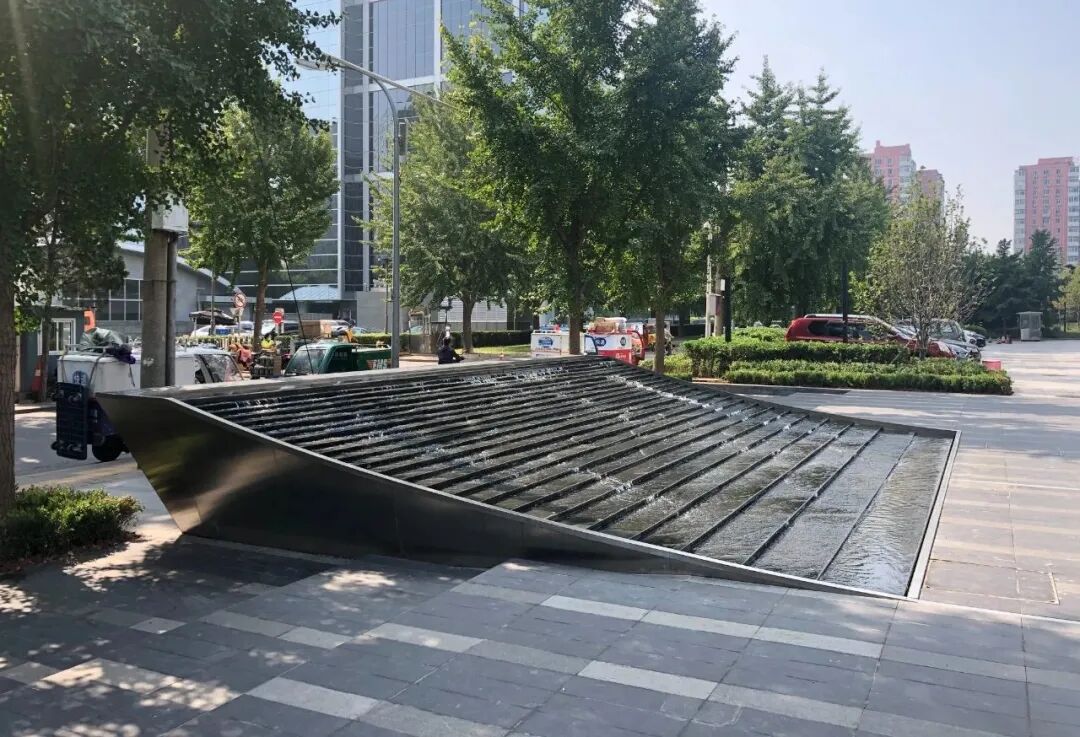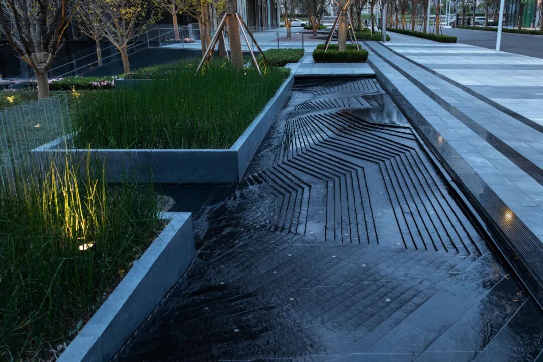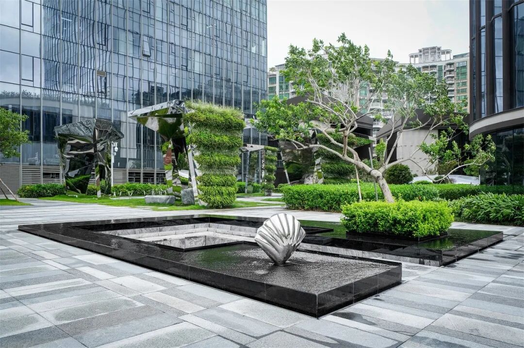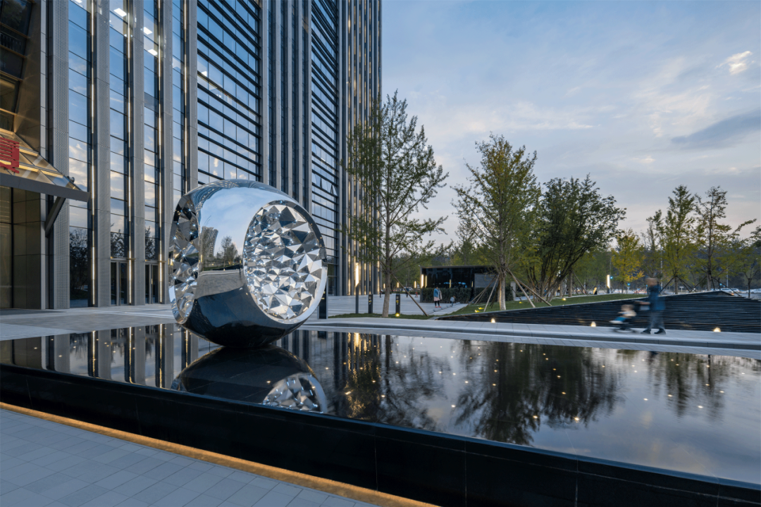 水景中心的球形雕塑是整个JA地块的视觉中心。镜面金属材质的外壳和建筑主楼的材质相得益彰,体现着专注、严谨的企业文化;球形中心的钻石象征着坚毅、纯粹的价值观。静水面反射出建筑的竖向纹理与球形雕塑的倒影,整个水景雕塑与周围的环境巧妙融合。