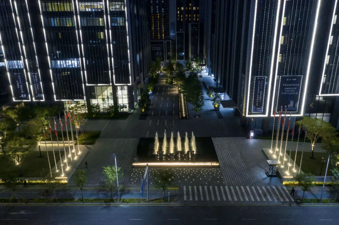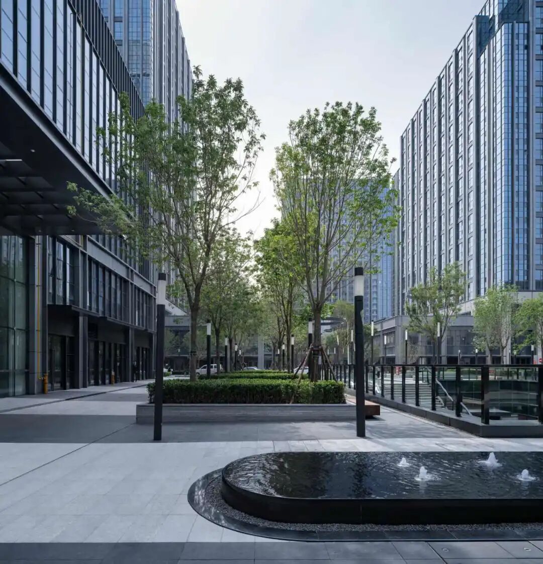 景观设计体现场地的四季更迭变化,打造了休闲剧场、场地运动、艺术雕塑、水景四大主题景观。5万平米超大景观园林,绿化率高达30%,形成了独树一帜的都市园林式办公环境。独具匠心的音乐喷泉和园林景观,远远望去如同洒满阳光的花园,与楼群相辅相成