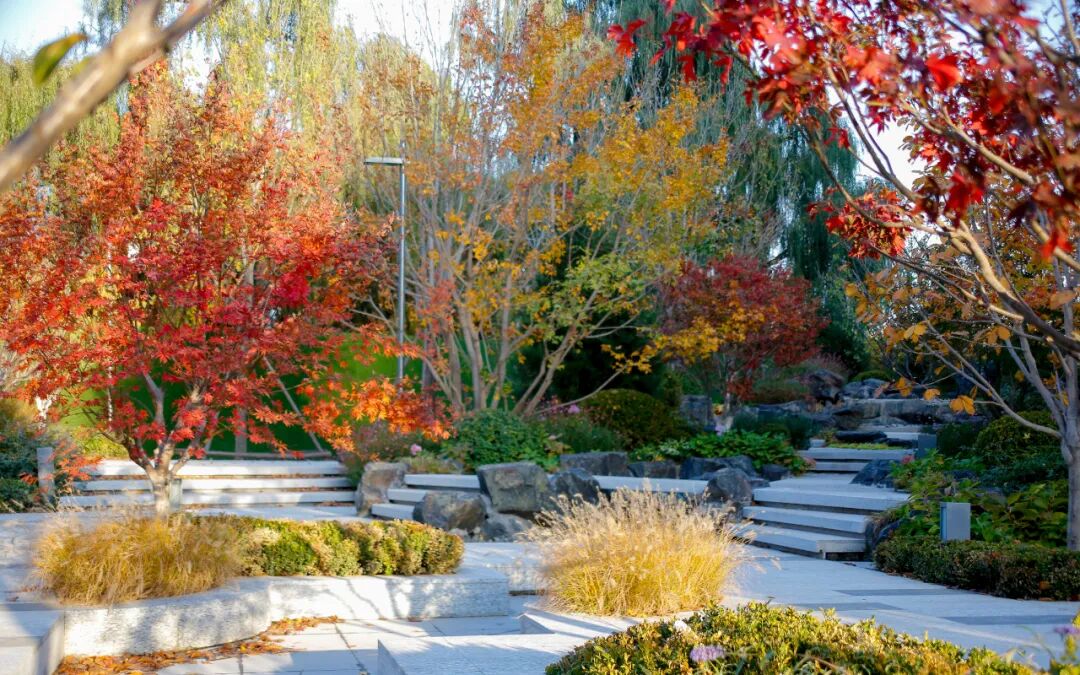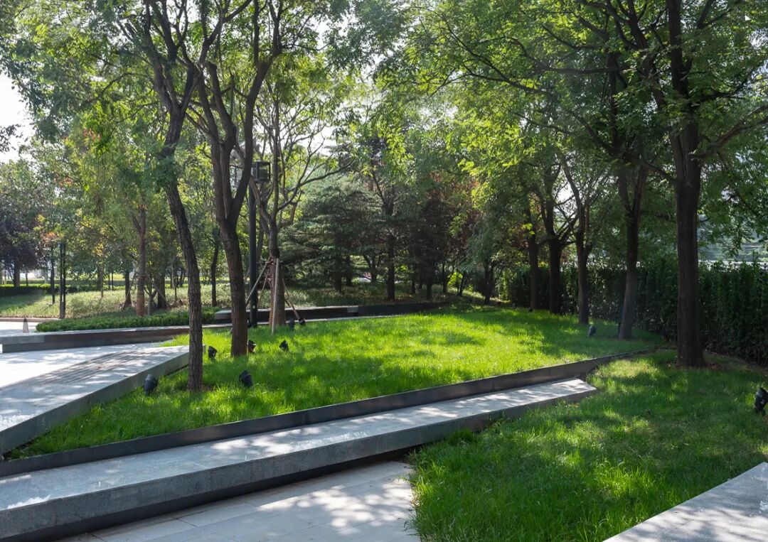 北侧景墙两侧的休闲花园,在线性空间营造亲人尺度的休闲花园。利用地被植物和较为低矮的花灌木和竹林营造植物环绕的停留空间,让人体味一丝静谧。