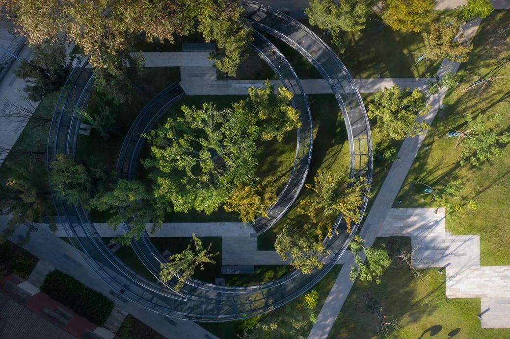 景观提出高度统一的设计解决方案,旨在以强烈的一种设计语言应对限制和挑战,从而将场地重新整合在一起,同时赋予场地灵活性和兼容性。层叠错落的悬浮式构筑,以其高低变化和玩味的组合方式,配以恰当的绿植(乔木、灌木组合)以及增加覆土条件, 从而缓和、隐藏并消化原本消极的限制影响。