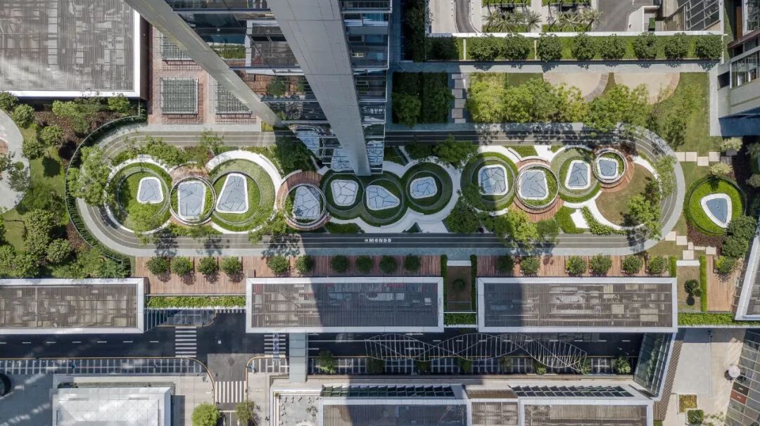 作为无限极(中国)有限公司全球总部,项目包含两座8层高“商办同圈”建筑,并由两条连廊与一条天台绿径相连,俯瞰形成象征无限循环的" ∞ "。景观由此划分出南北广场、中心互动区、两座建筑中庭、屋顶花园及边界种植区。