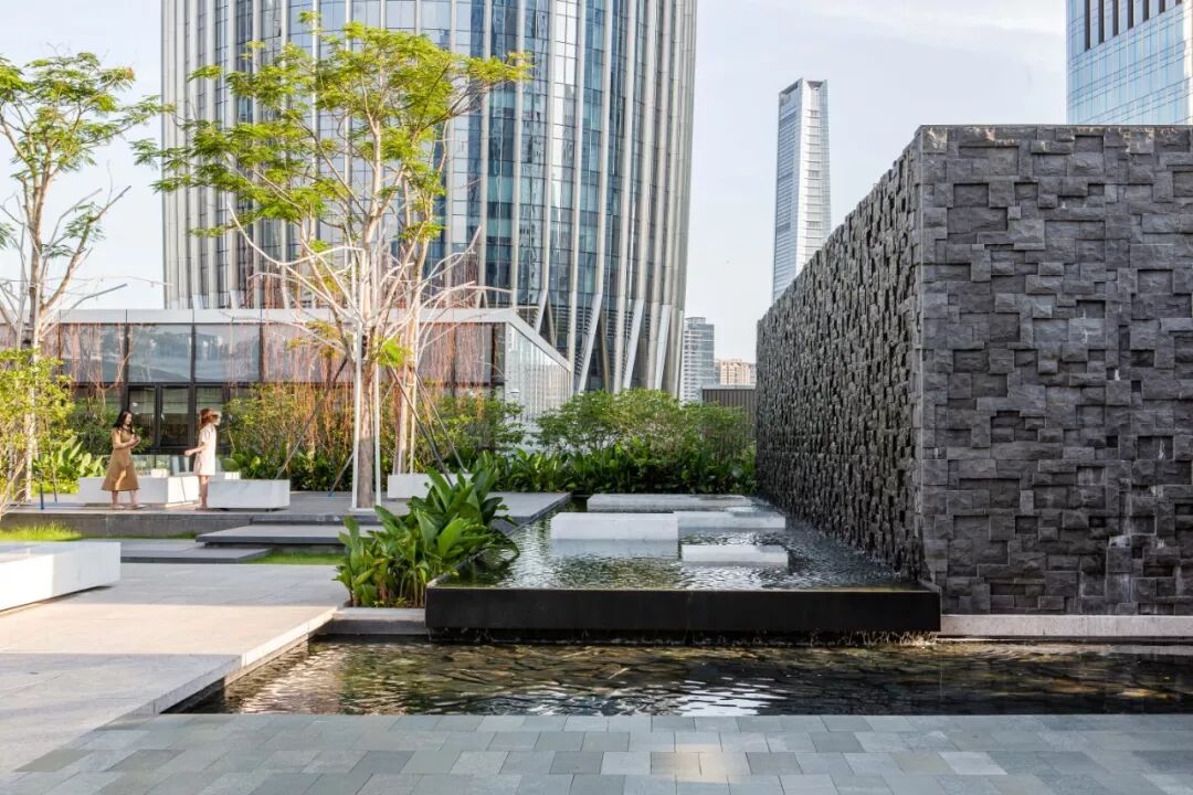 商业街区部分紧邻梅园路和笋岗地铁站,是项目重要的城市展示界面,也是未来万象食家创新商业最主要的入口空间。一个形态与天幕相呼应的水景广场,成为了整个空间的焦点。由此,笋岗中心的前广场成为梅园路沿线最具开放性和标识性的公共空间。