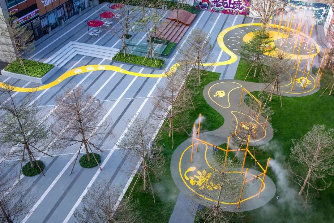 一栋栋坡屋顶的建筑错落相接,设计师在一层空间留出了商业街道,二层则由连廊串联,贯穿蜿蜒,形成了第二层的街廊。在整体空间构架之中,设计要平衡的是消防环道,外摆空间、商业活动与自然之间的关系。在反复推敲如何避让消防、店招及满足功能所需之后,我们如愿种下了“大树”,将“小桥”、“流水”隐喻于流动的铺装之间。
