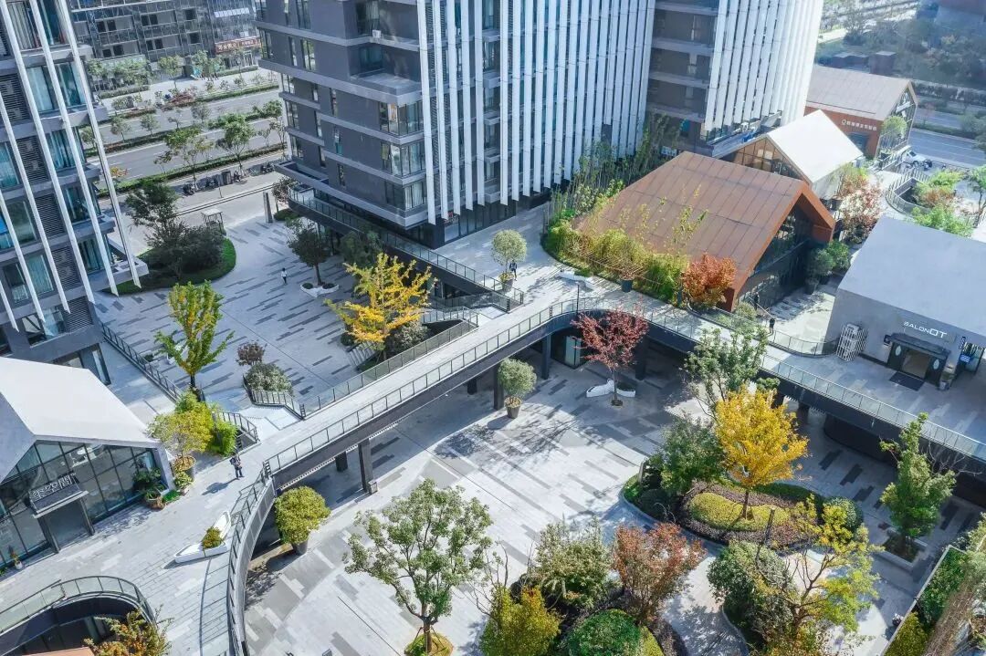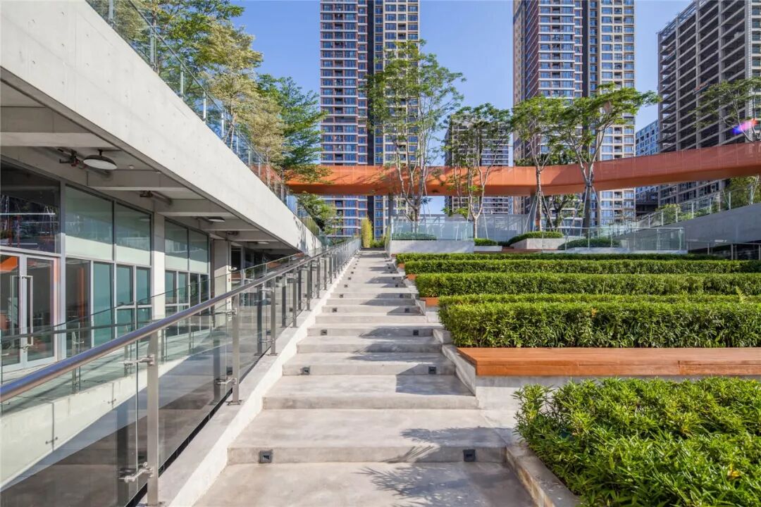 对街坊整体景观设计提出统一整体的景观环境营造思路,SED设计团队从整体效果出发,通过“云端生活”主题理念贯穿整个空间设计,形成整体统一的“云”共享平台,将丰富的纵横绿化装饰与形式由空中连廊自然过渡到花园,由花园渗透到市政公共绿地及市政二号渠。选择适宜当地气候的花卉沿着空中连廊延及雨水花园尽情绽放,这将为基地带来更多的暖意、色彩和肌理。