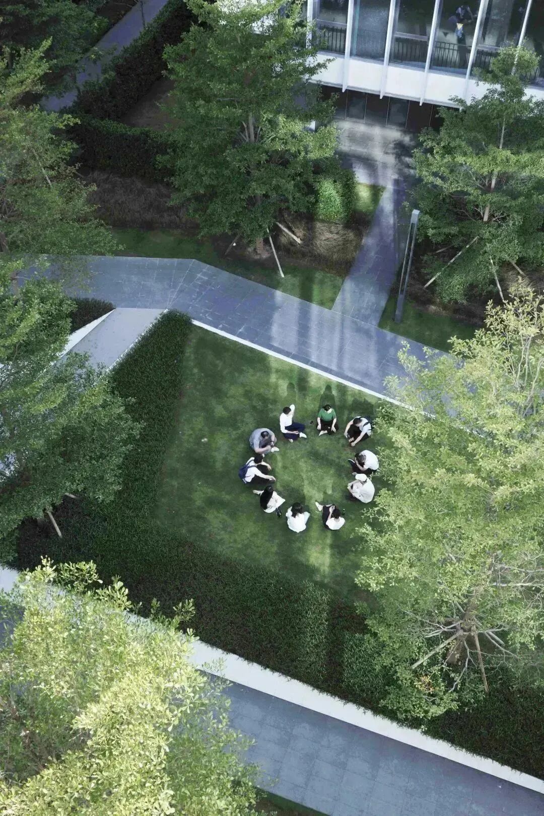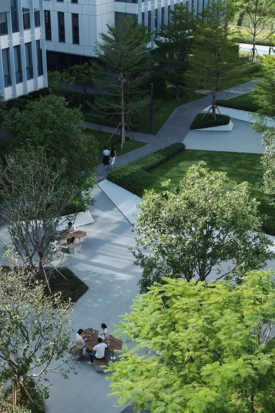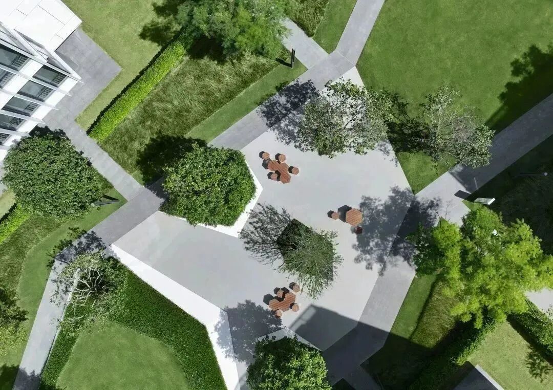 在这个轴线的中心区域,我们设计了很多休闲桌椅,人们可以在这里休憩放松、户外办公。有需求时还可与草坪合并为一个整体场地使用,供企业开展户外PARTY、趣味运动会等。而当我们在室内处于忙碌的办公中时,一次不经意的眺望,优美的绿色环境亦能让我们拥有短暂的心灵释放。