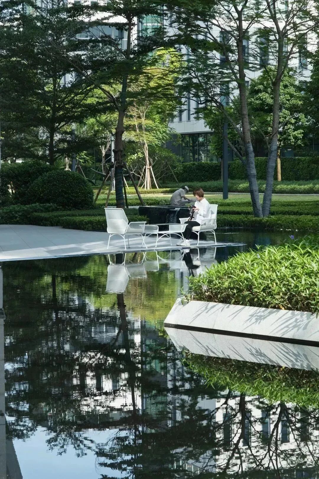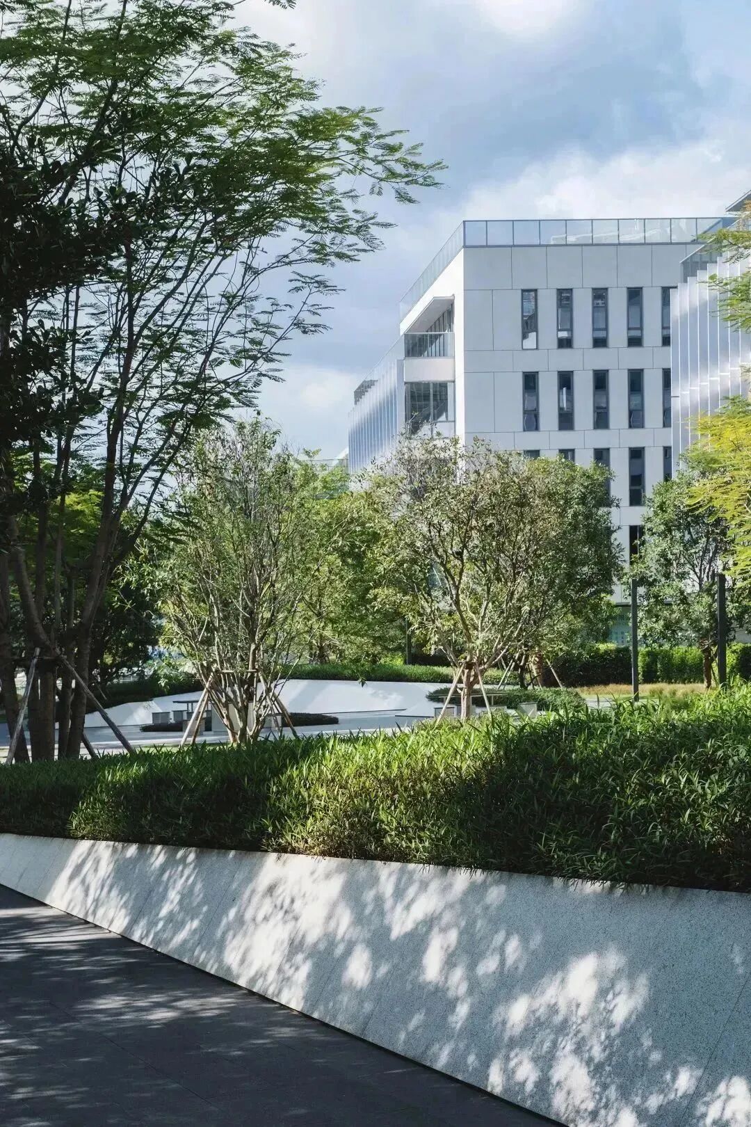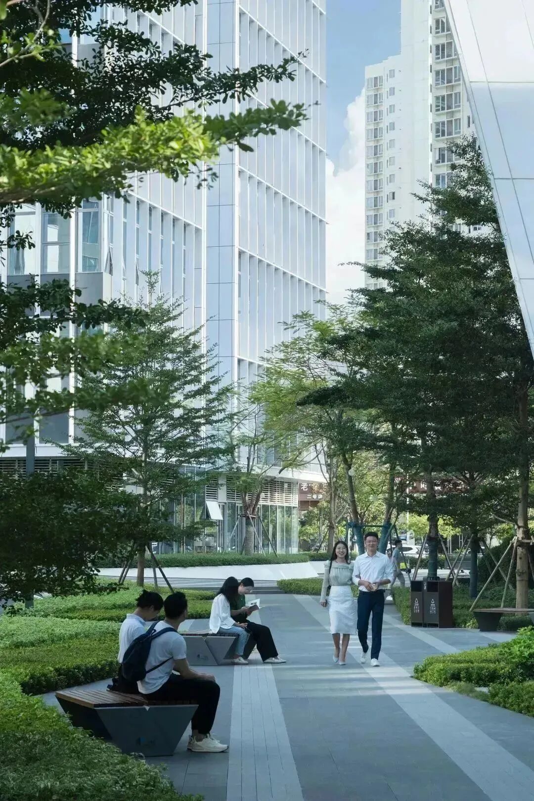 在这个轴线的中心区域,我们设计了很多休闲桌椅,人们可以在这里休憩放松、户外办公。有需求时还可与草坪合并为一个整体场地使用,供企业开展户外PARTY、趣味运动会等。而当我们在室内处于忙碌的办公中时,一次不经意的眺望,优美的绿色环境亦能让我们拥有短暂的心灵释放。