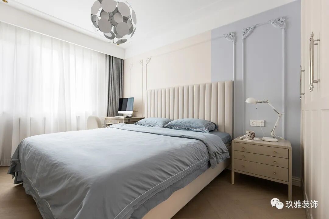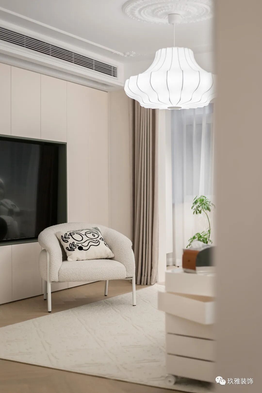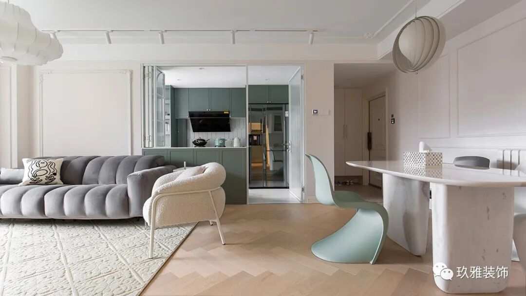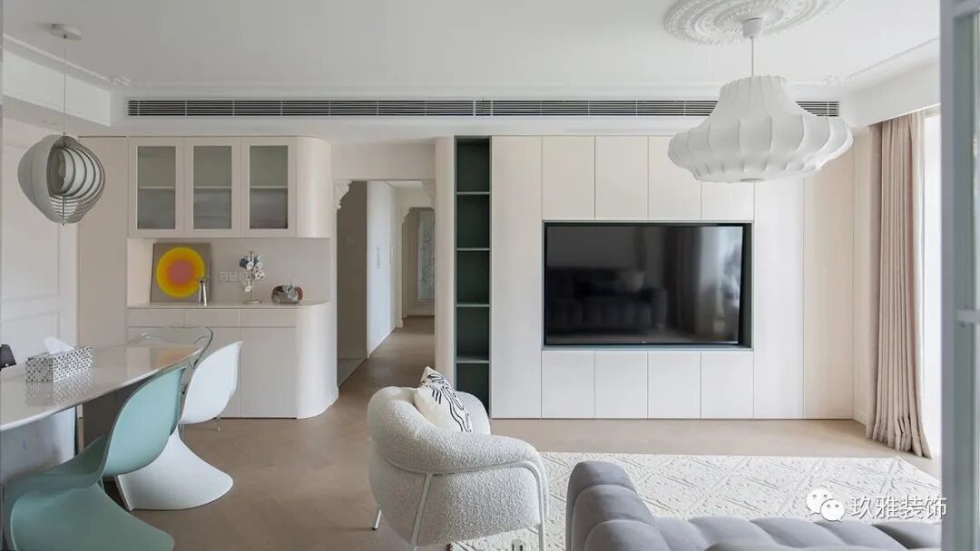这是三世同堂的小班级,上小学的宝宝,60岁的爷爷奶奶,充满了活力。客厅的按摩椅就是为两位老人准备的。男屋主平时喜欢看大片,离不开投影仪;女屋主表示喜欢法式风格,但又不能太素。因为有孩子和老人,家里每天都会开火做饭。设计师就是班委,满足和平衡每个人的需求,比如六口人的收纳空间,超多的厨房家电等。