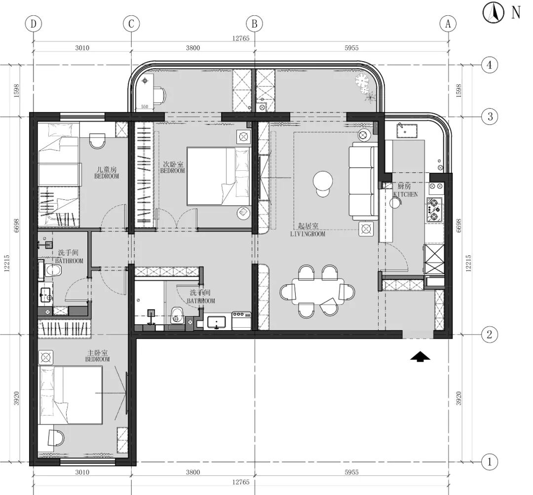 电视柜与餐边柜侧面都做了圆弧处理,相对应。