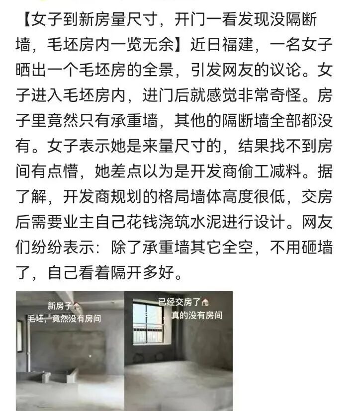前两天我看到一则新闻,说一个购房者收房的时候发现,交付的毛坯房只有承重墙而没有房间的分隔墙。评论中有叫好的,说省了敲墙的钱;也有说开发商交付与图纸不符是违法的......众说纷纭。