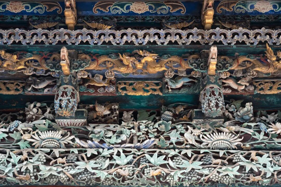 檐下两侧的二龙戏珠、凤凰牡丹雕刻尤其亮眼,工匠采用圆雕手法,将龙凤的头部脱离背景,置于画面之外,无论站在何处,采用何种角度,立体感都是跳脱的、恣肆的。
