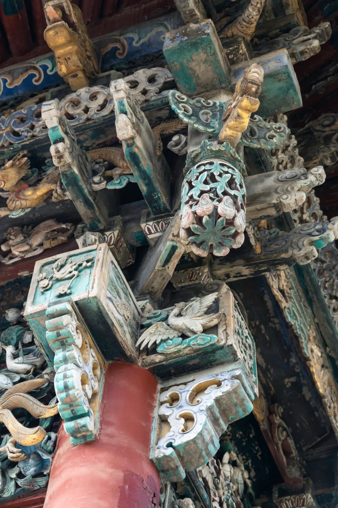 曾经在洛阳那座山陕会馆里,我自以为找到了一些独属于那里的特色,没想到在这里也如出一辙:檐角脊兽不是各种神兽,而是“四小人”,象征商人重义;雕刻纹样二龙戏珠成了“二龙戏蛛”,寓意商路如蛛丝般四通八达。如此种种,不一而足。
