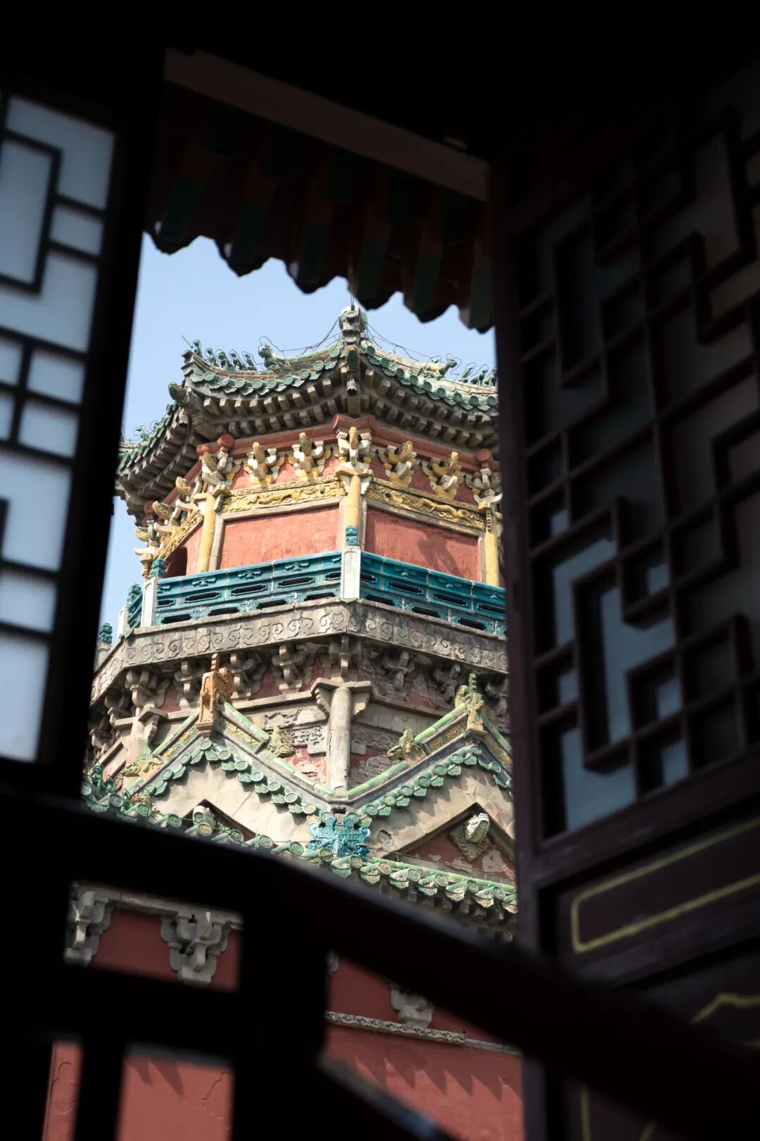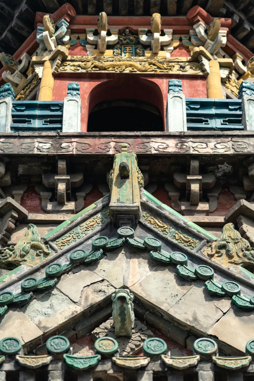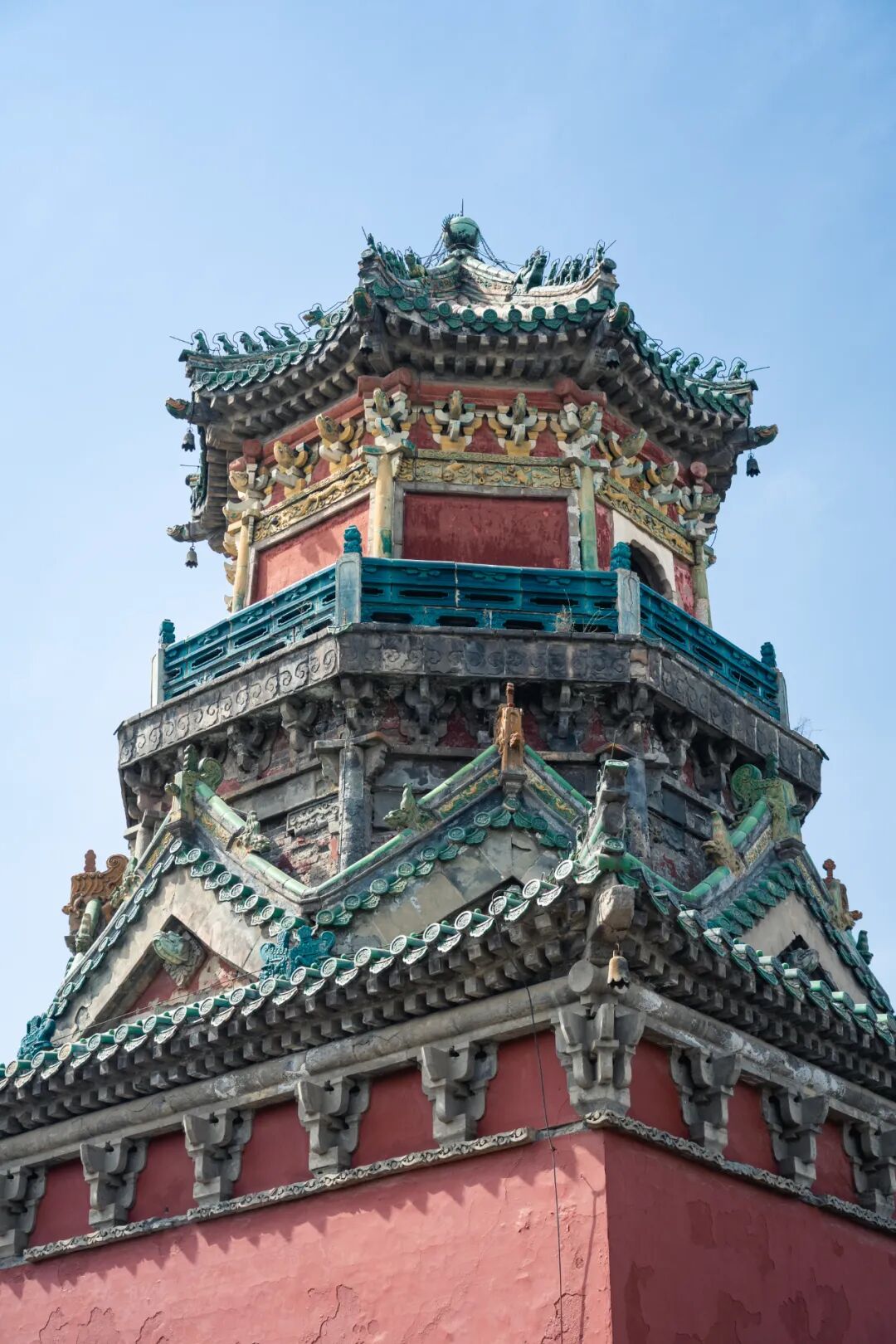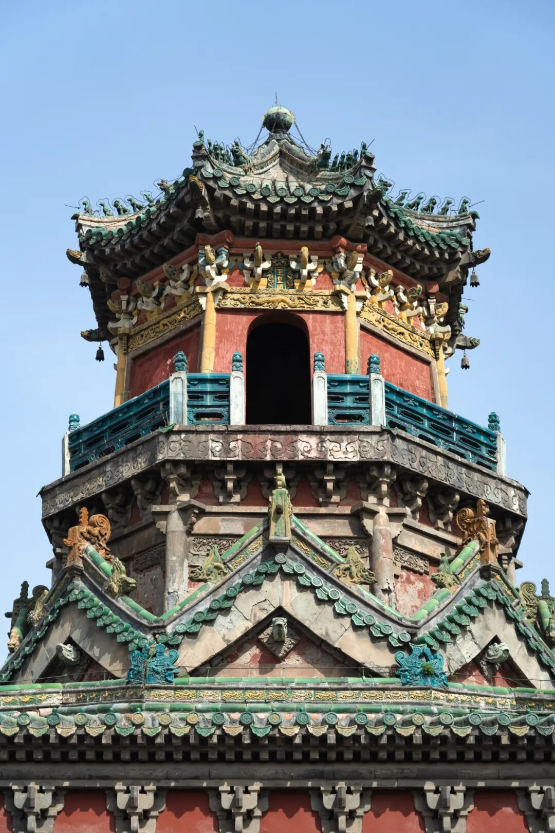 中层突然过渡到八棱形,并用绿琉璃瓦做出了连续环绕的山花,像连绵起伏的峰峦,这样的转换是相当罕见的;