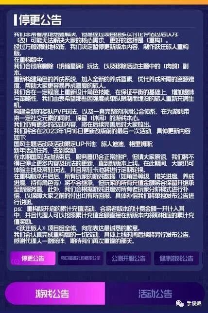 但是游戏的停服公告表示,他们从没想过要跑路,而这次停服是为了进行游戏的大规模重构,也就是在没有预期的未来将会推出《跃迁旅人 重构版》。