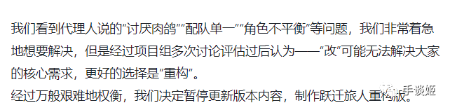 《跃迁旅人》游戏官方的解释如下,说有疫情误工的原因,有公司资金紧张,人员变动等原因,但人家《猫之宿约者》画师怀孕还知道“请个半年产假”让玩家有点盼头,而《跃迁旅人》则表示将另行说明但现在也没说明。