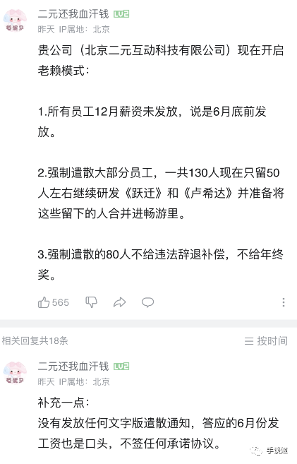 在《跃迁旅人》B站停服公告下,有自称该司(二元游戏)的员工表示公司已经拖欠了员工工资,并以违反《劳动法》的手段遣散了将近一半员工。