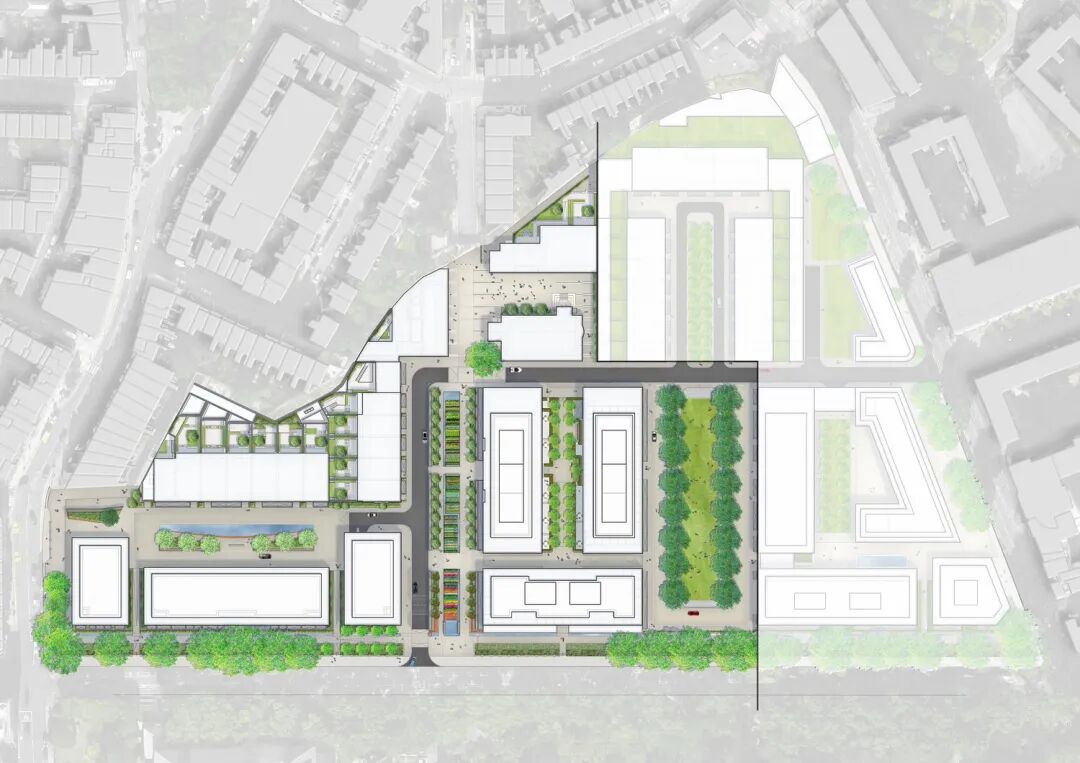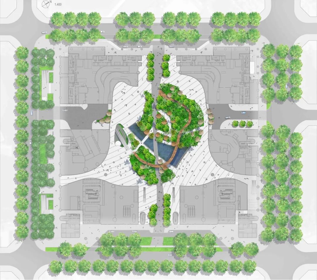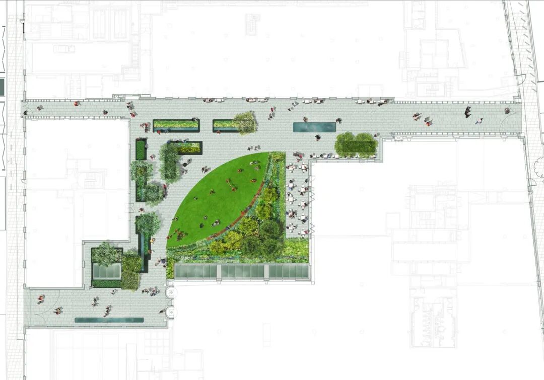 景观和街景设计的特点在于多样化的新型公共开放空间,包括步行街、街巷、广场和街坊公园,以及新建筑上层融入的多个景观露台和绿色屋顶。