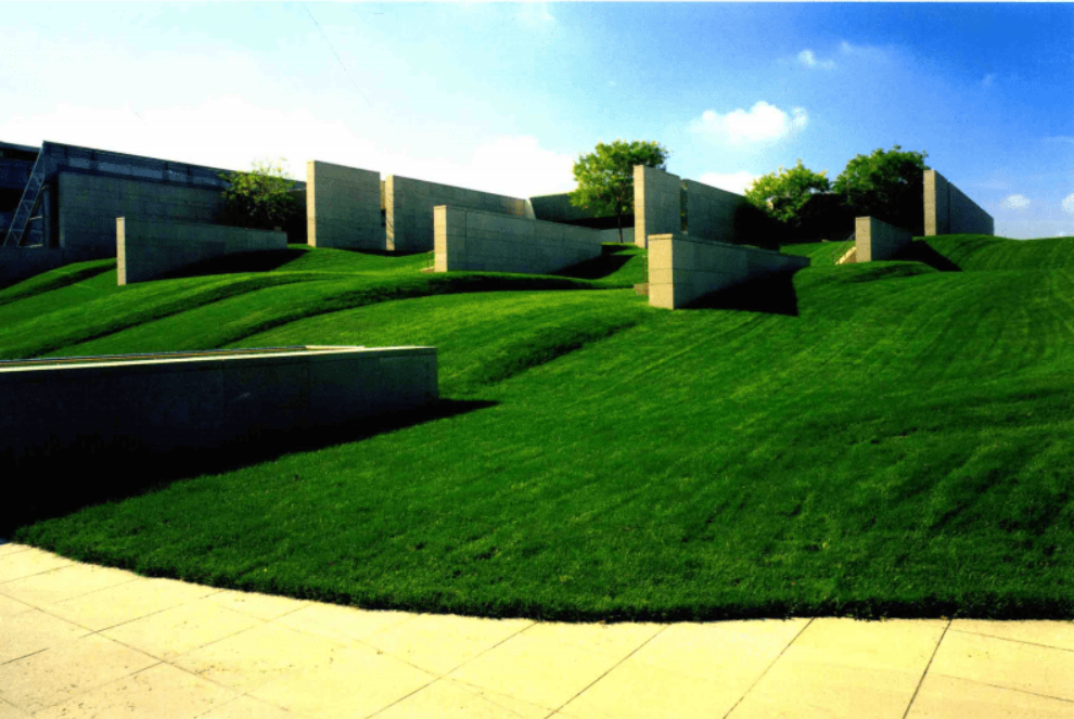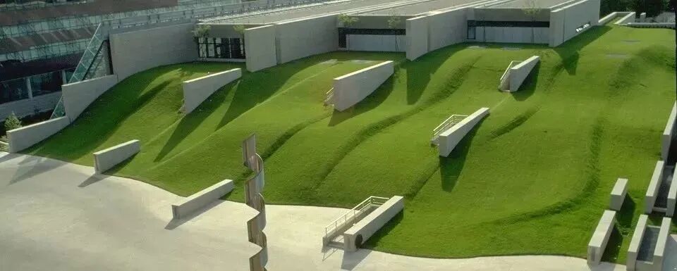 草坪象征流动的石油、石墙代表变成化石后的物质岩石,而流水和石柱则代表了石油的提炼过程。从实用主义的角度考虑,这种结构还可以将处在地势较低位置的停车场及车间掩盖起来。