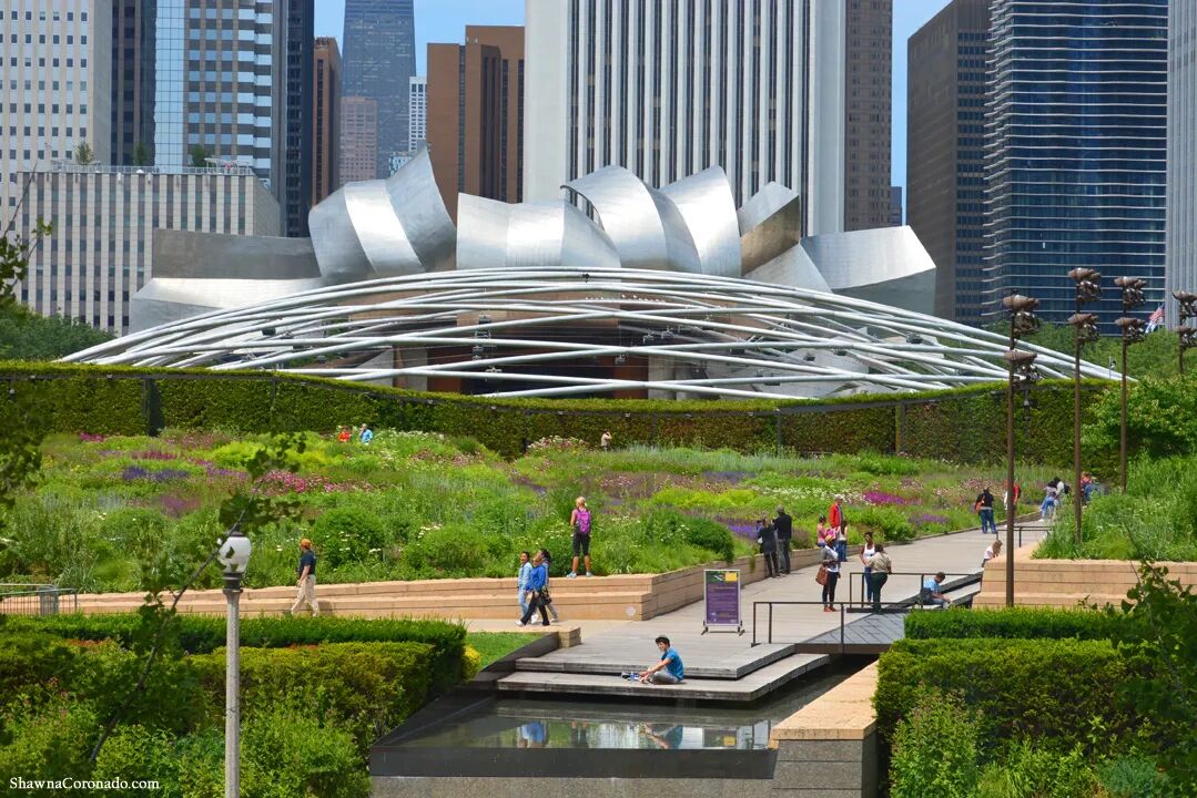 设计中通过排列、隐喻等手法体现了这段历史,并赞颂了“芝加哥精神”。卢瑞花园分为“黑暗广场”和“光明广场”两个部分,由名为“裂痕”的栈桥分割,“黑暗广场”讲述着城市遭遇的灾难,“光明广场”讲述着走向光明的“浴火重生”。