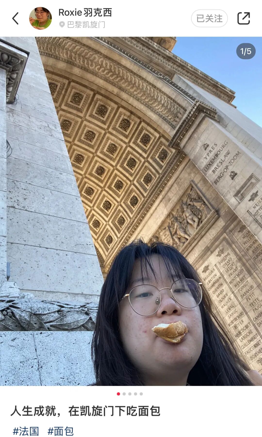 这个夏天,22岁的女孩羽克西独自去巴黎旅行,在知名地标凯旋门下,她用前置镜头拍了几张自拍,上传社交网络,配了两句话:人生成就,在凯旋门下吃面包。