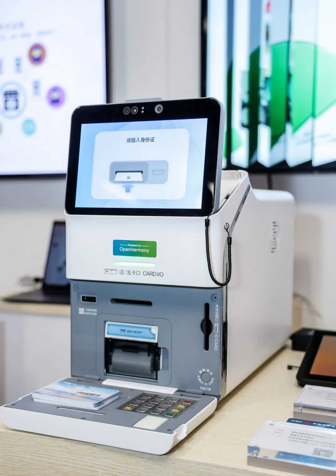 基于金融设备的精准服务场景需求,现场展出了多款基于OpenHarmony打造的大屏多功能金融服务设备。其中还有一台是行业首款基于OpenHarmony3.1版本打造的金融服务终端。工作人员在一款大屏的竖屏金融服务设备前向《壹观察》介绍称,这台设备主要应用于惠农与金融普惠场景,比如可以便捷地放在村委会,其支持磁条卡、存折、接触/非接触式IC卡三种形态的银行卡,支持二维码与人脸支付,从而形成了“卡码脸”一体高度集成的全场景支付功能。对于村民来说,一台小型机即可完成首款、缴费、水费电费手机等各种充值需求。除此之外,还拥有非常广的扩展功能,比如农村老人的社保定期确权(人脸+身份证核验),农村政务在金融领域的集成,相当于银行网点通过小型一体机直接深入到中国的广大乡村,从而有效推动“数字乡村”与普惠金融的落地速度,在有效提升银行对广大乡村服务覆盖与服务升级的同时,有效控制成本提升运营效率,从而形成普惠金融的正向发展迭代效应。