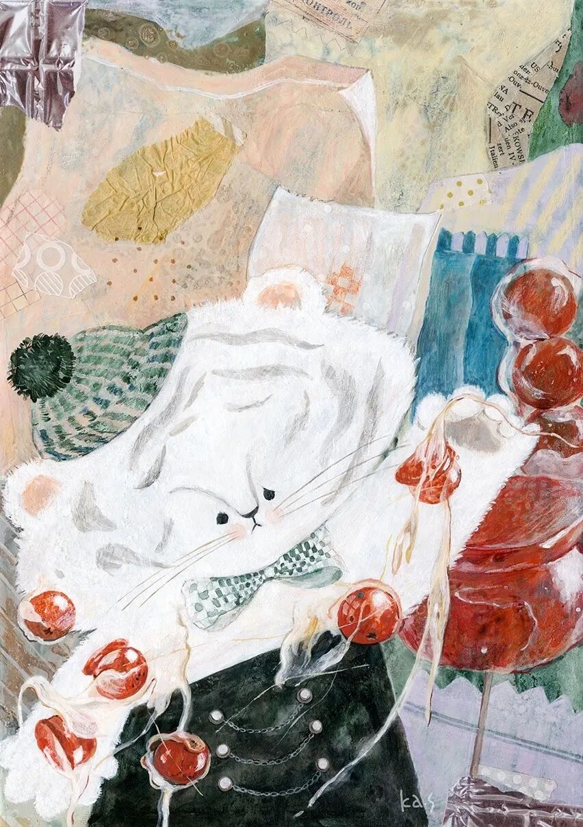创作思路:一个没有嘴的小姑娘去过的,存在于我脑海中的世界吧。整个系列也是杂志的封面12期,12个不同的世界观。这个女孩的形象,是我一直以来沿用的。不画嘴的理由在于,没有嘴就没有明显的表情。这样一来,看到它的人,当时是什么心情,那他眼里的小姑娘就是什么表情。就可能,更容易带入到自己身上吧。她走过的路,停下的地方,或许看画的人也想去看一看。想听听她的故事。
