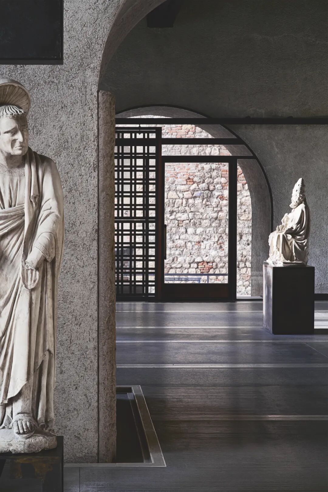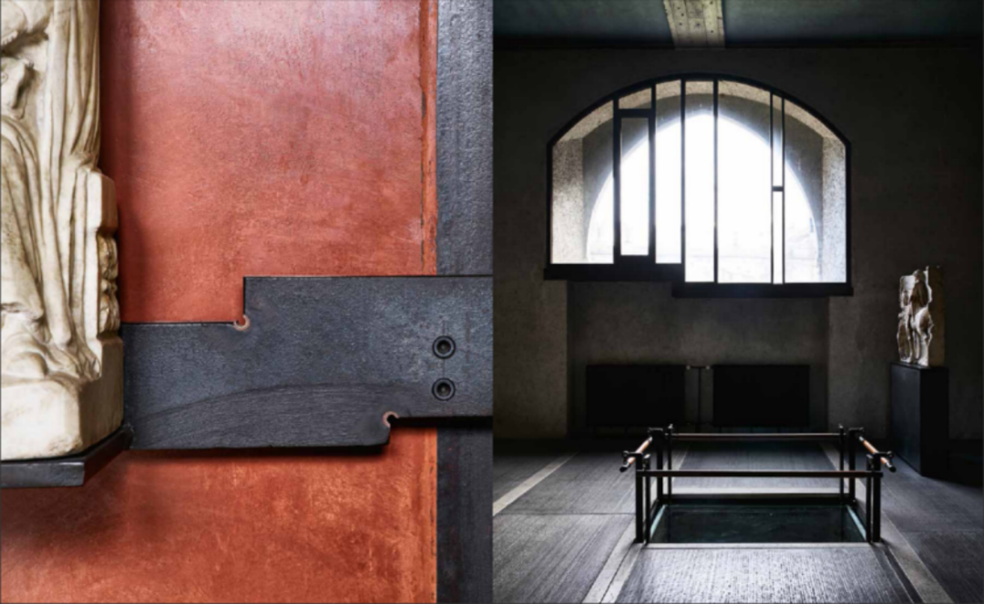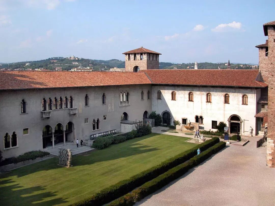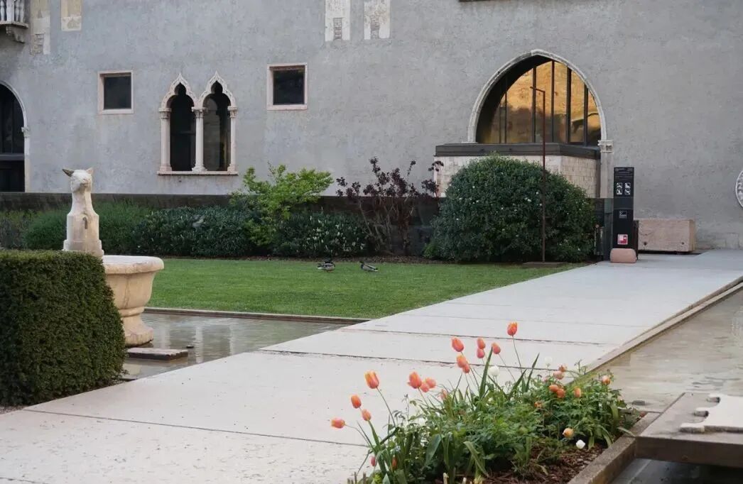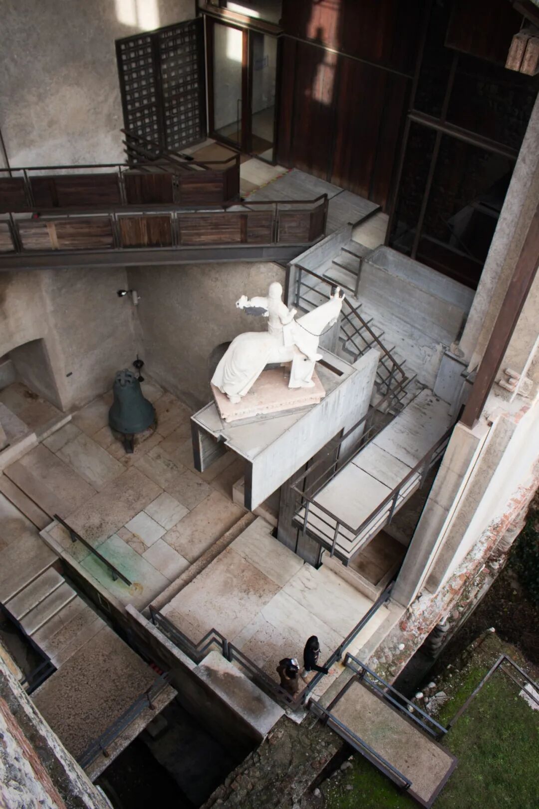 在两栋不同历史时期建筑的交界处,与古城墙和桥梁之间的枢轴交叉点上,卡洛·斯卡帕拆毁了重建的东侧的一部分,将大公爵骑马雕塑与墙体成角度的挑出于现代材质的水泥平台上,高高的置于庭院上空,使这座雕塑成为各个历史汇聚点的中心和建筑空间的高潮,同时也创造出更多的对视空间。