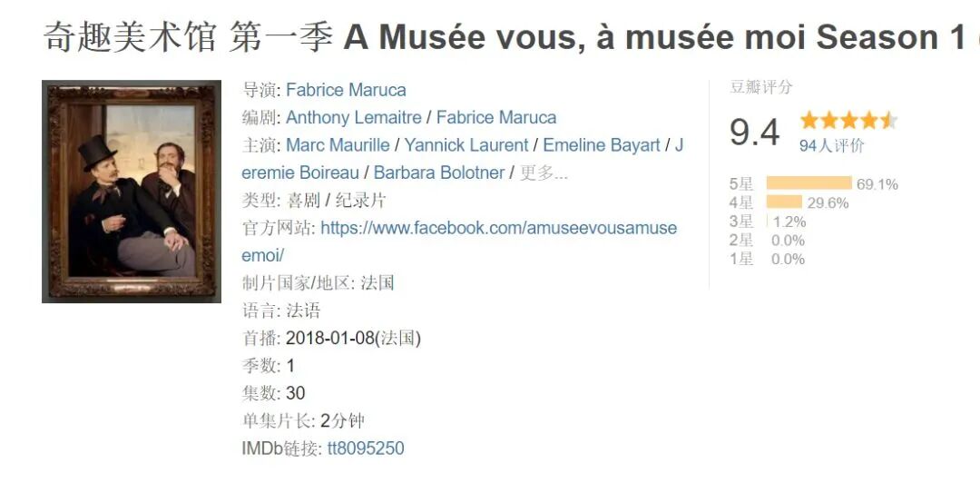 如果你看完了《此画怎讲》还意犹未尽的话,不妨看看这部同样是由真人演绎讲解西方名画的纪录片。《奇趣美术馆》在豆瓣上的评分高达9.4,在B站上也很有人气,评分高达9.9。这个系列目前一共三季,90集,包含30幅画作,每一集大概2分钟,分3集为主题介绍一幅名画。