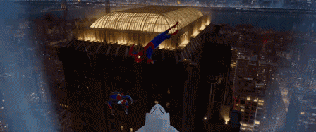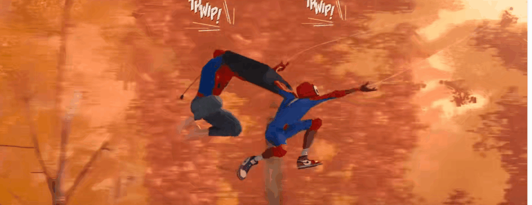 在这一个场景中,小蜘蛛迈尔斯和彼得帕克同时在空中飞跃。