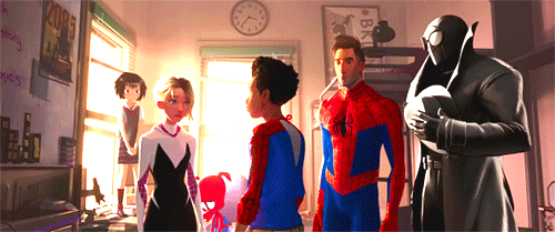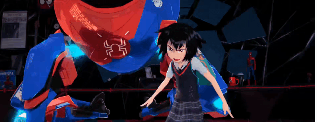 彼得·帕克是传统美漫风格;潘妮·帕克和猪猪侠则是日本二次元,所以直接用2维动画表现;而来自二战时期的侦探蜘蛛侠,则是黑白像素风格.....