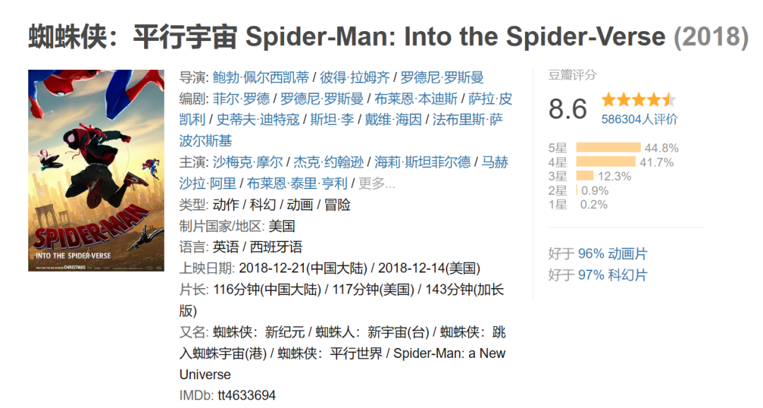 期待值高原因也很简单,《蜘蛛侠:平行宇宙》系列首作令人惊艳,豆瓣评分8.6分,并连续摘获第91届奥斯卡最佳动画长片、第76届金球奖最佳动画长片、第72届英国电影学院奖最佳动画等一众大奖。