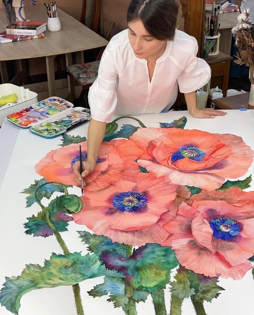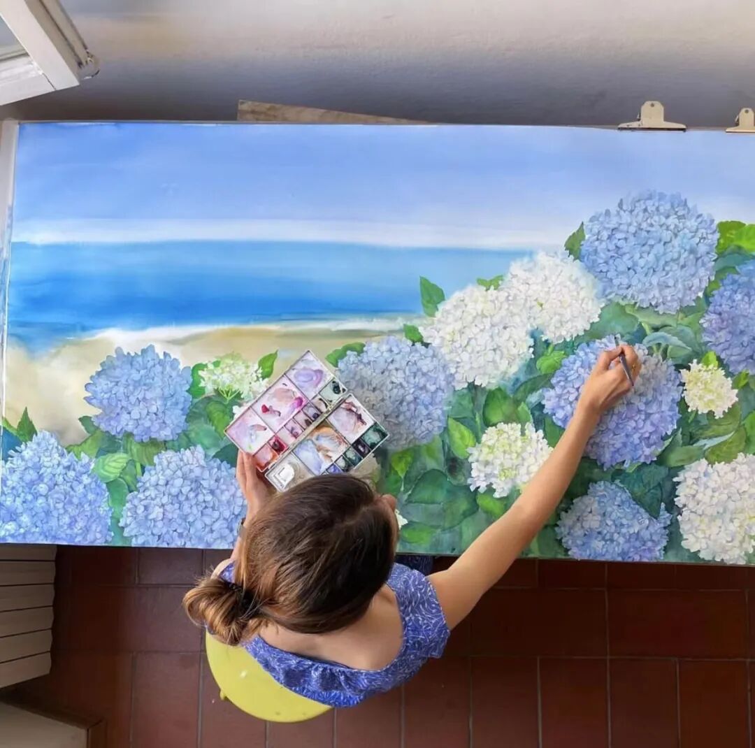 Janet Pulcho创造了巨大的、堪比人类大小的2m超大花朵,她的大型水彩画系列捕捉了从绣球花到牡丹等不同花朵的空灵之美。她将所有在现实生活中经常被遗忘的细节在她的画作中放大和美化。她通过自己的作品努力分享着生活中美丽而鼓舞人心的东西。