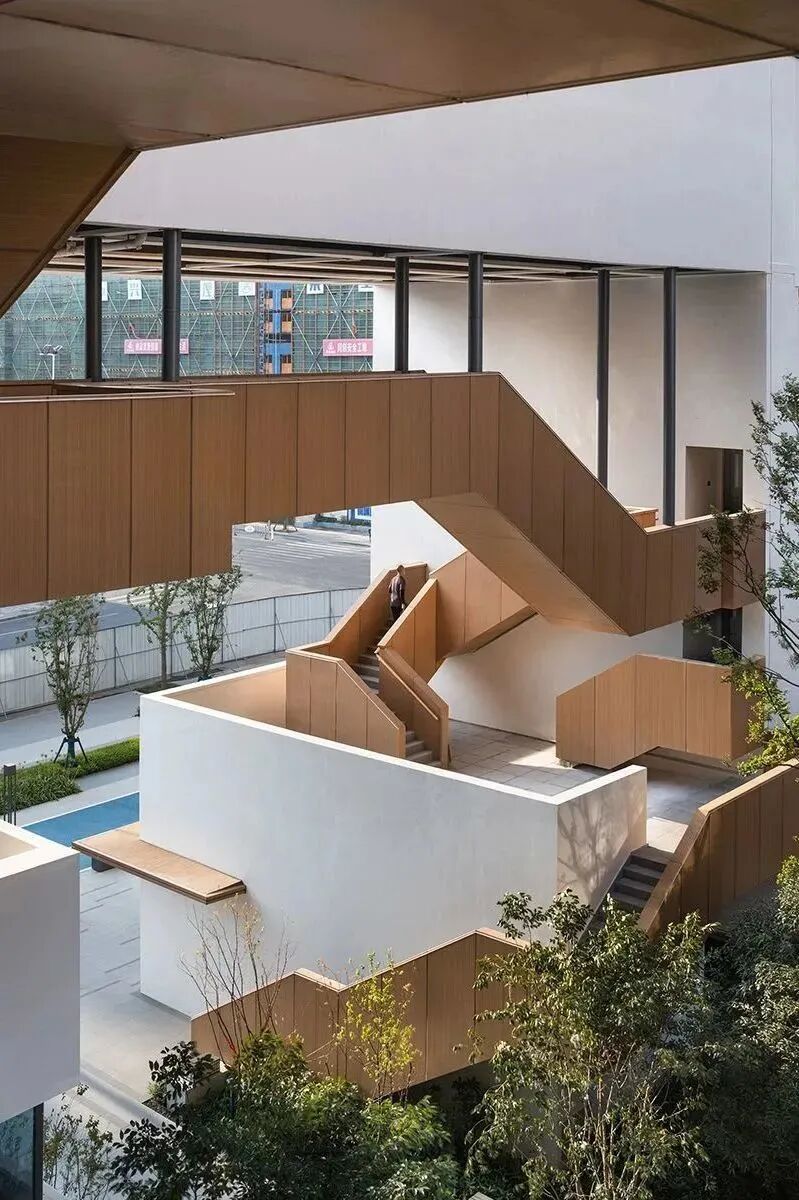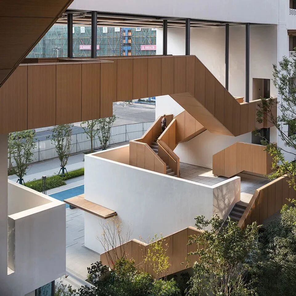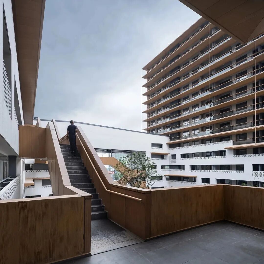 有熟人的基础,设计采用外廊式住宅布局。为了让空间尺度更亲切、舒适,设计用白色与木纹涂料分界7层空间上下,还运用了衢州古城拱形门洞和传统民居水平挑檐的形式,唤起“老宅披檐”的衢州记忆。