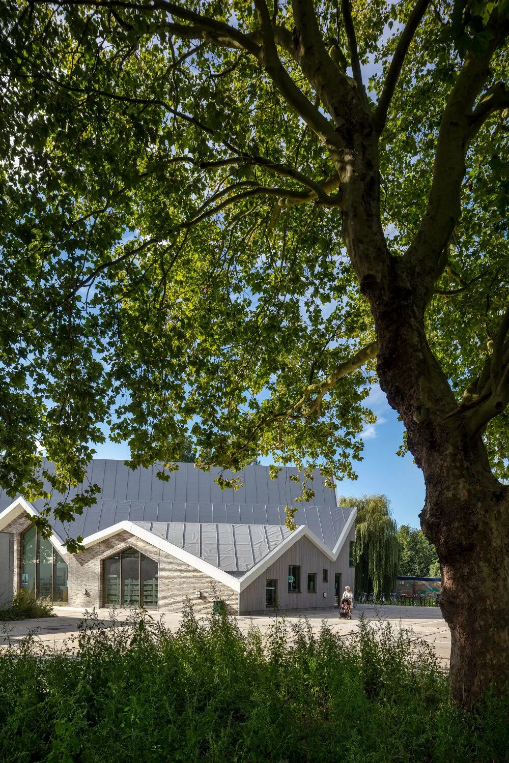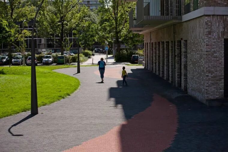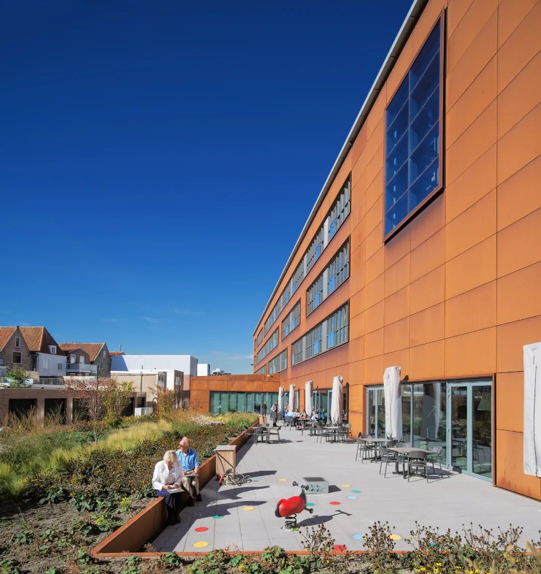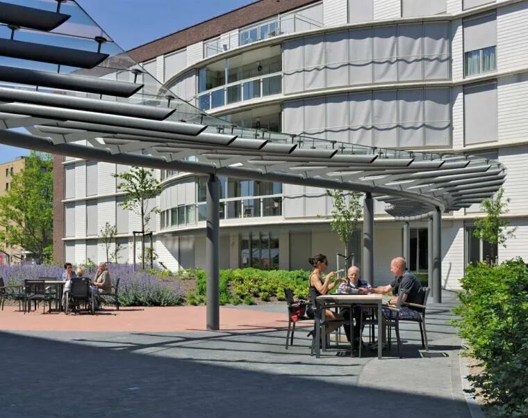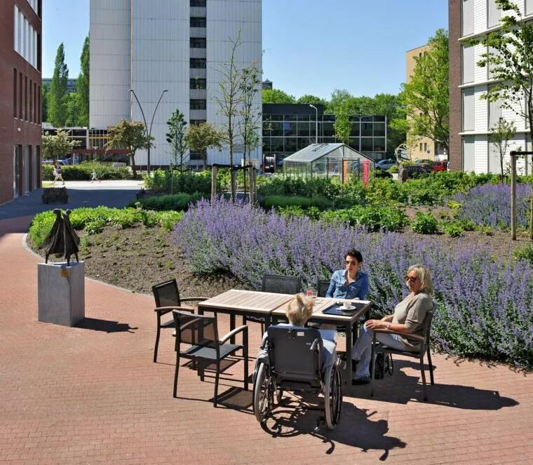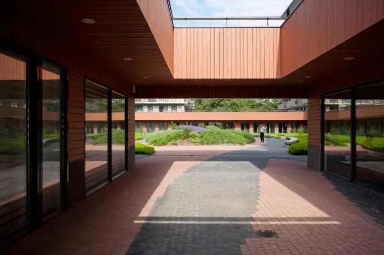 荷兰Amstelveen地区的Zonnehuis老人院有一个新鲜活力的绿色区域。场地上的不同建筑都是通过一个方形广场连接在一起,地面铺砌采用了独特的花纹图案,场地中种有许多不同种类的大树,并安置了其他的休闲设施。