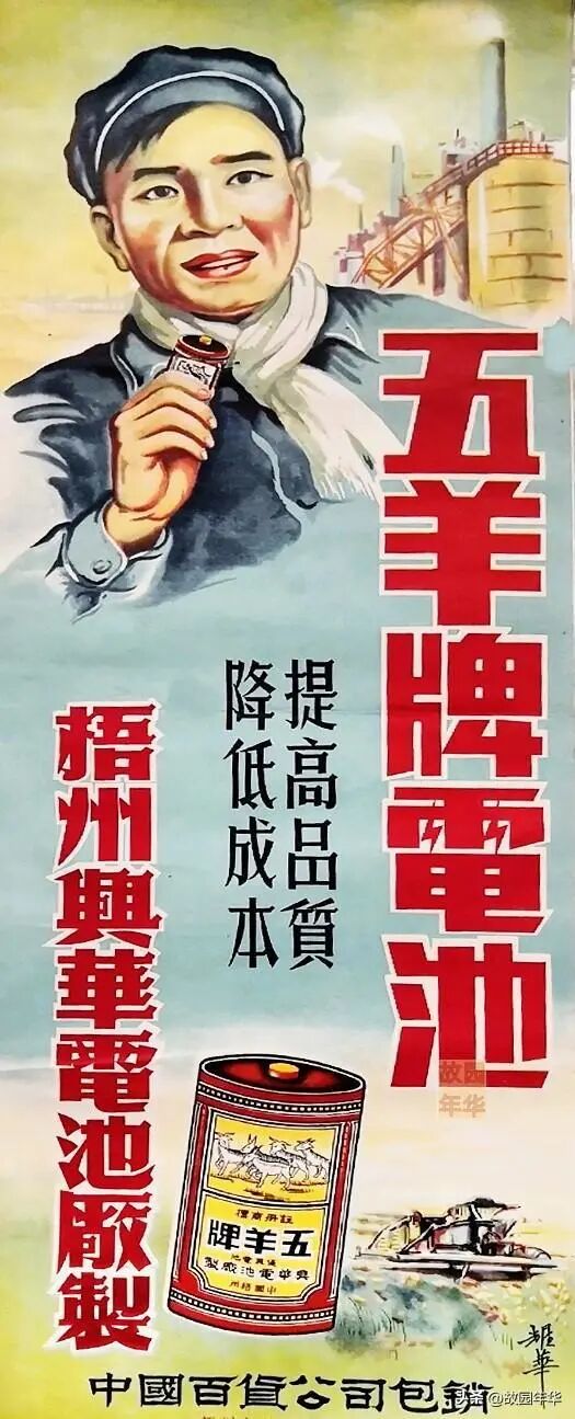 梧州兴华电池厂制作出品“五羊"牌电池,广告词,提高品质,降低成本。