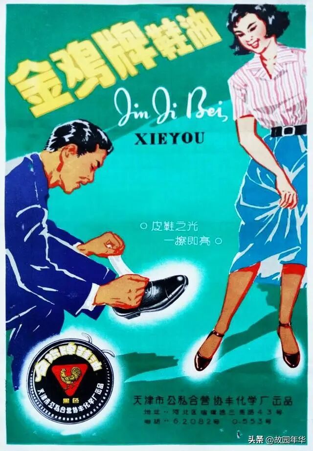 天津公私合营协丰化学厂出品,金鸡牌鞋油,广告词,皮鞋之光,一擦即亮。