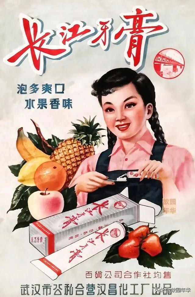武汉市公私合营汉昌化工厂出品,长江牙膏,广告词,泡多爽口,水果香味。