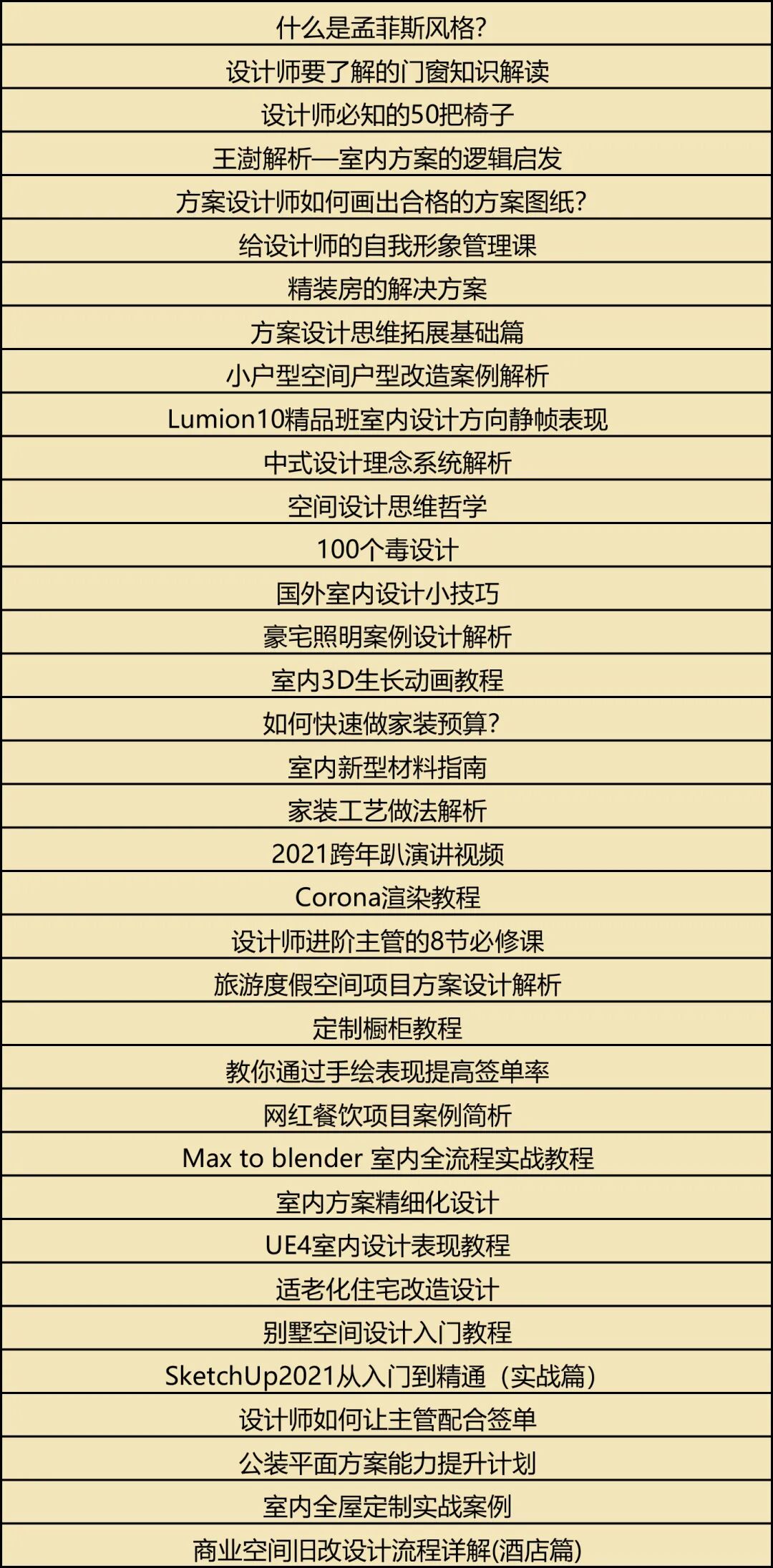 课程涵盖了室内设计行业全领域:材料工艺、制图技巧、方案设计、设计管理等10大专业板块知识点。