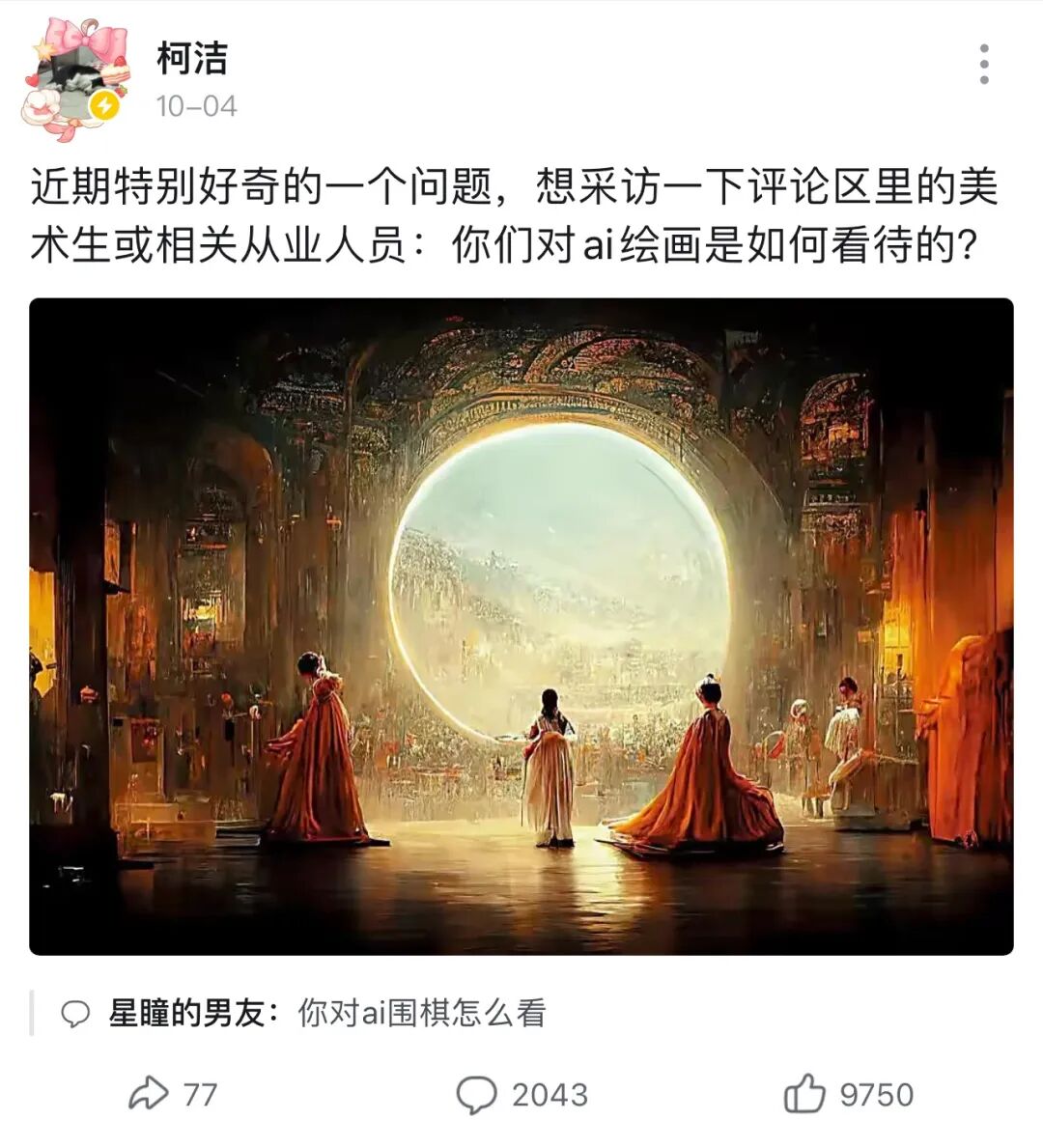 近日,中国围棋选手柯洁在社交平台的动态发出一个灵魂问题:美术生或相关从业人员如何看待AI绘画。