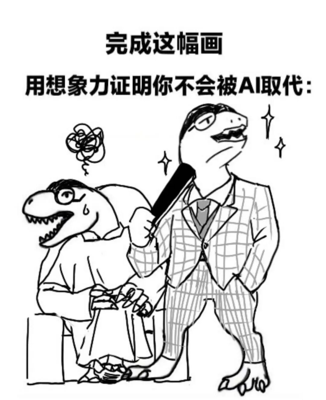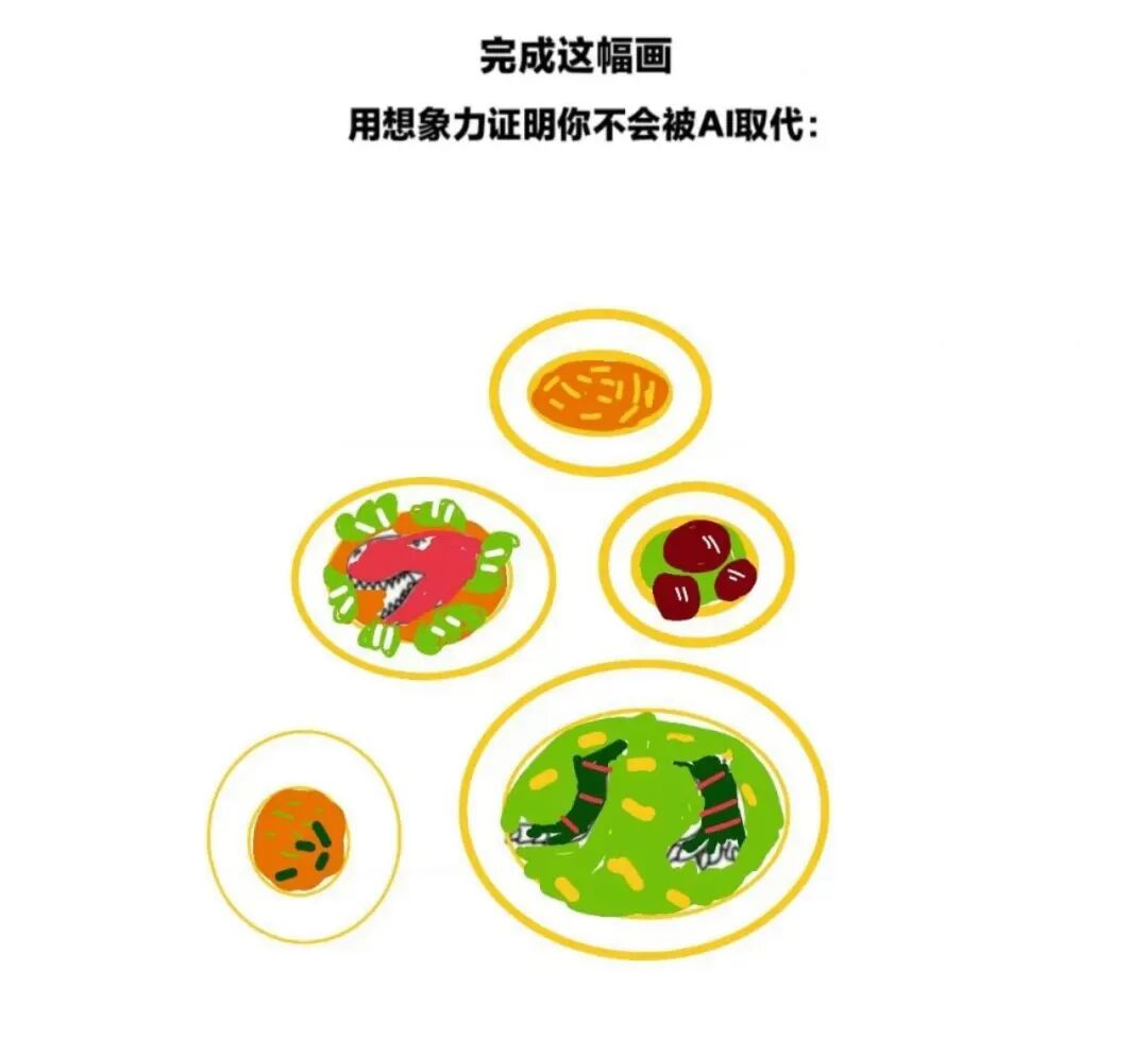 这场讨论还引发了一系列余震,近日网上出现了#一张画证明人不会被AI取代#的热搜话题,一场网友想象力和AI想象力的对决拉开序幕。