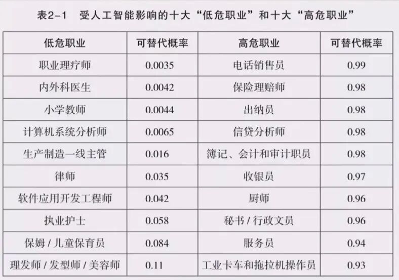 有网友专门总结了一份未来人工智能影响的十大“高危职业”和“低危职业”表,供大家对比参考。