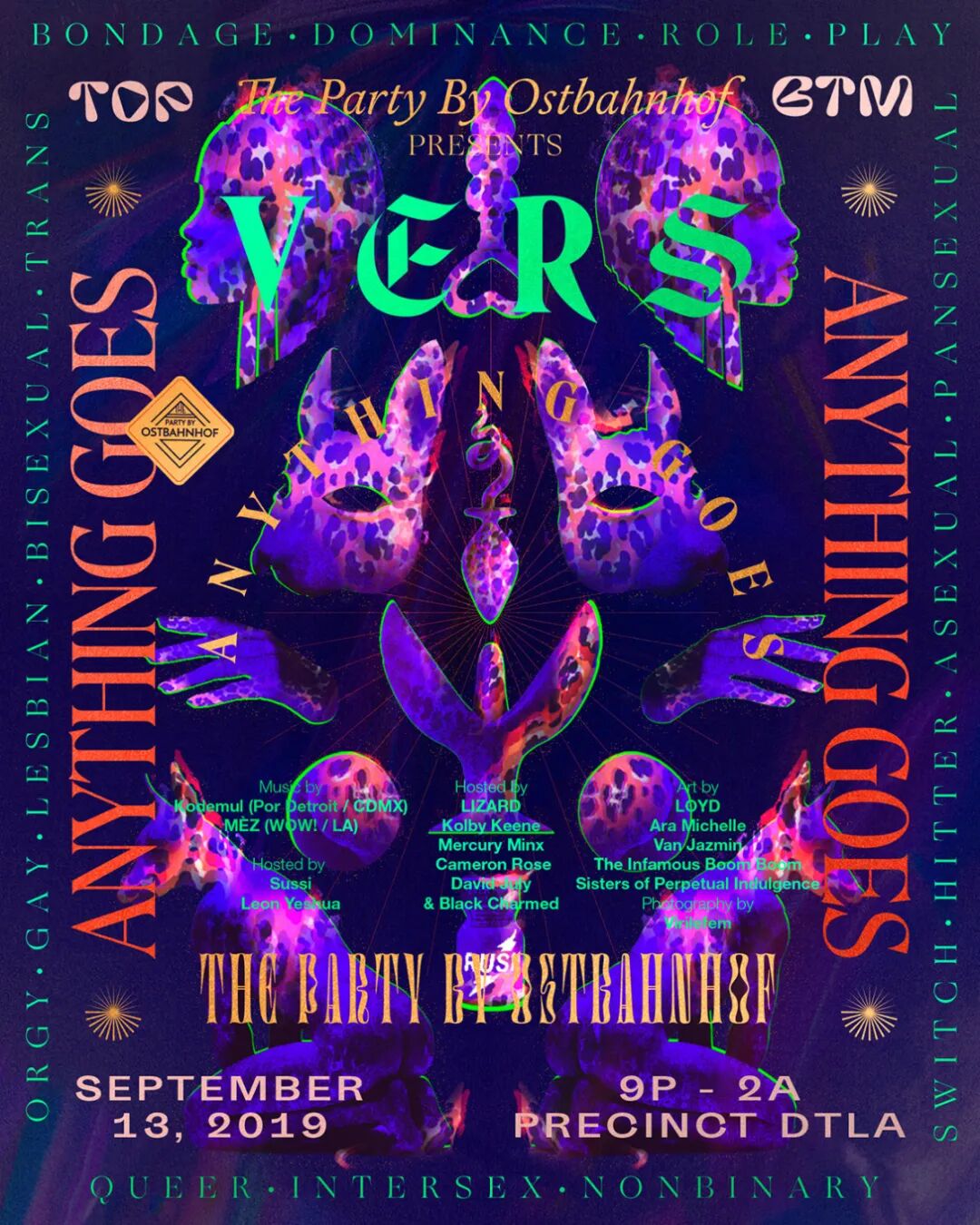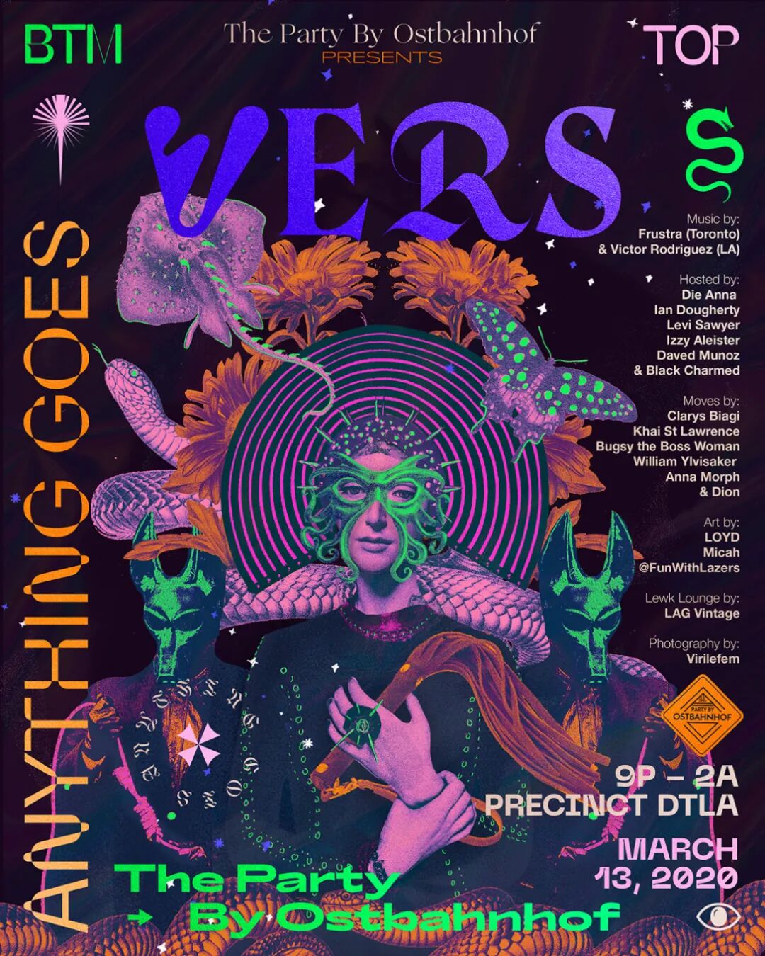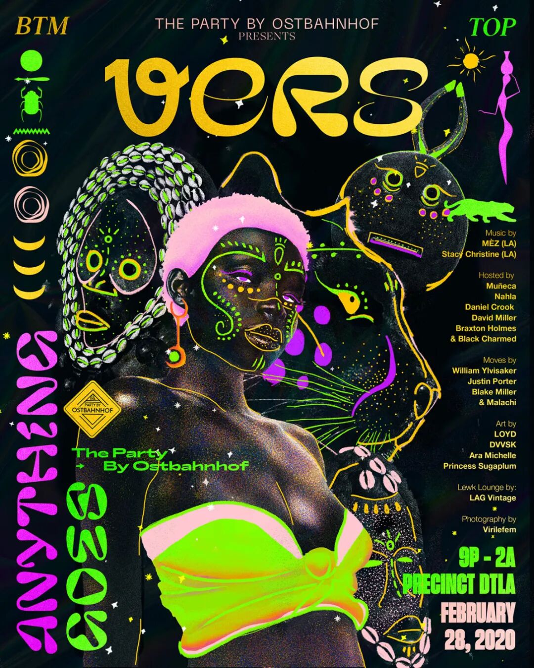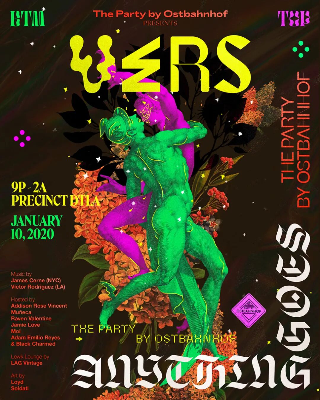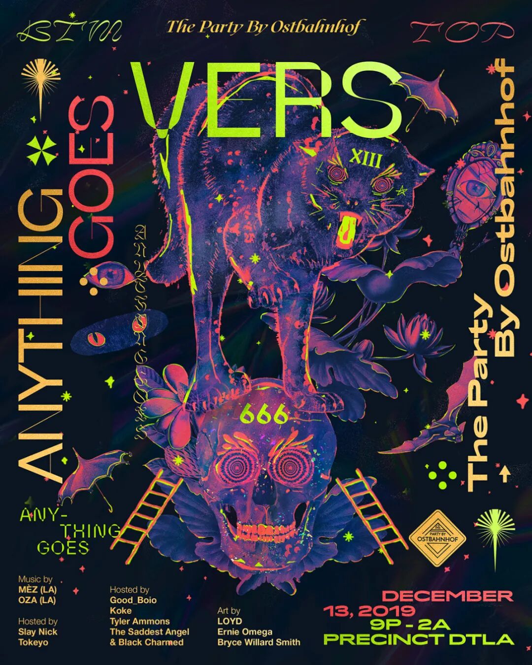 这是一个叫做Ostbahnhof派对的宣传海报,该派对融合了音乐、艺术、政治等多种元素。设计的主题为:什么都行。意思是这里无奇不有,在这里干什么都行,传递出这是一个极度丰富、自由、包容的派对。所以,在设计上也比较天马行空,拼贴风配图、对比强烈的荧光色、密集的构图和排版个性、个性十足的字体,无不传递出令人兴奋、向往的视觉感受。