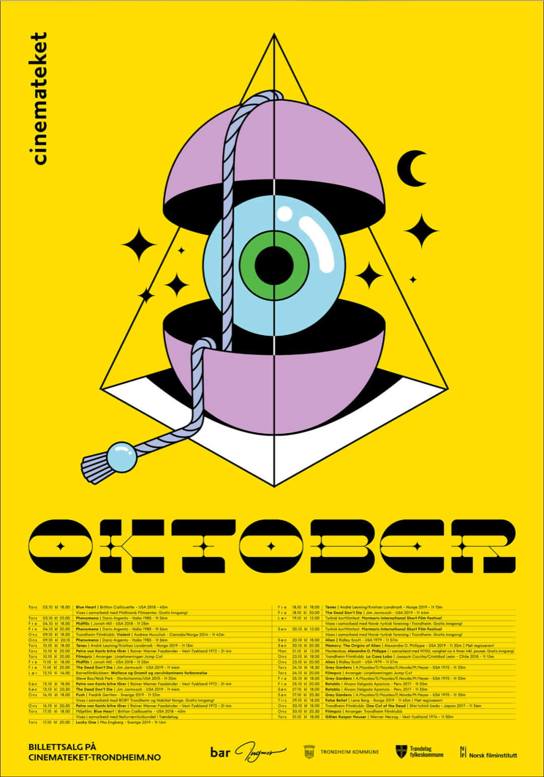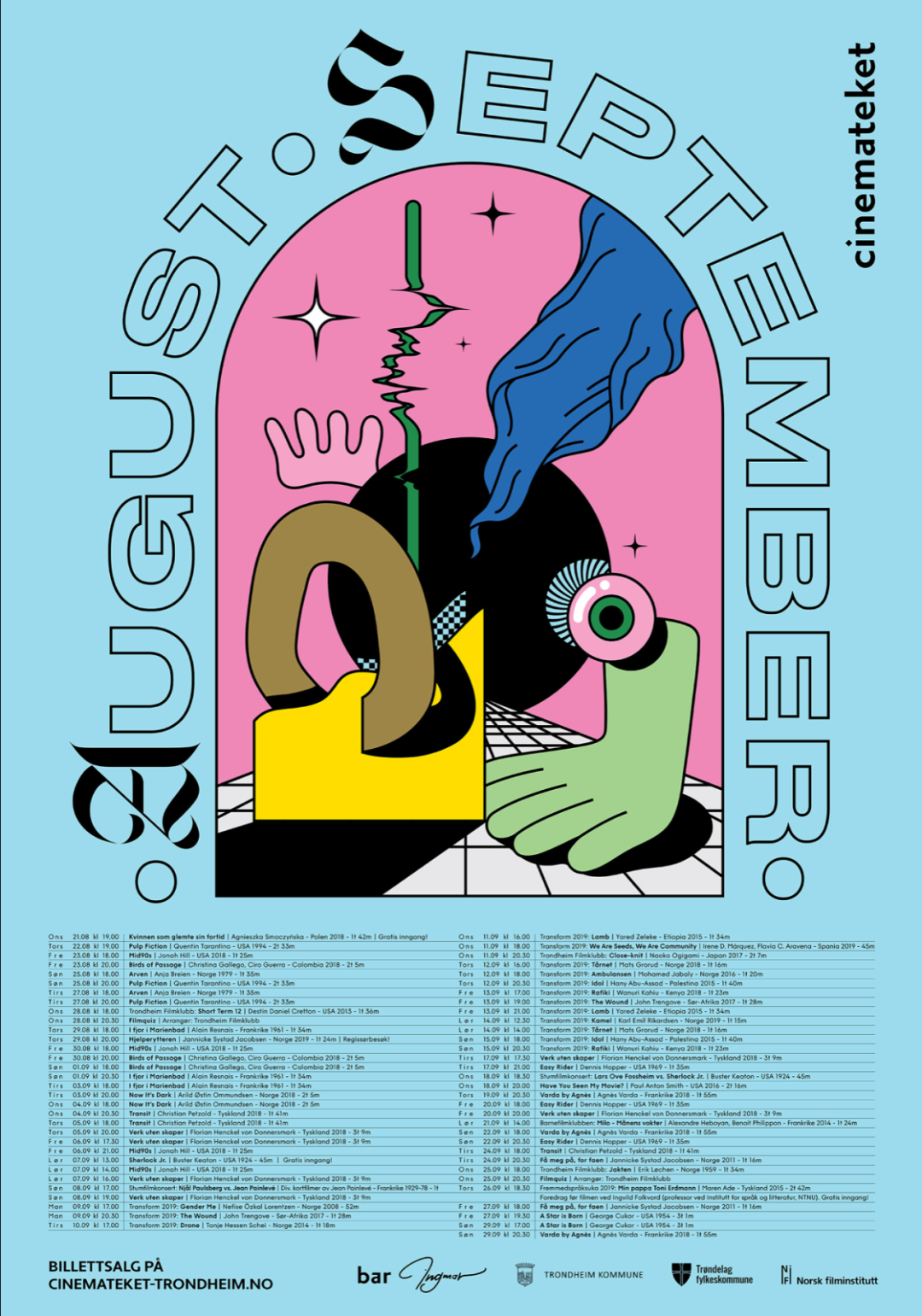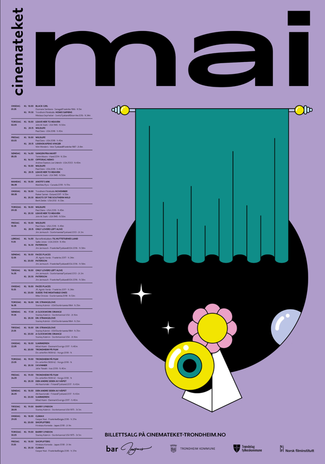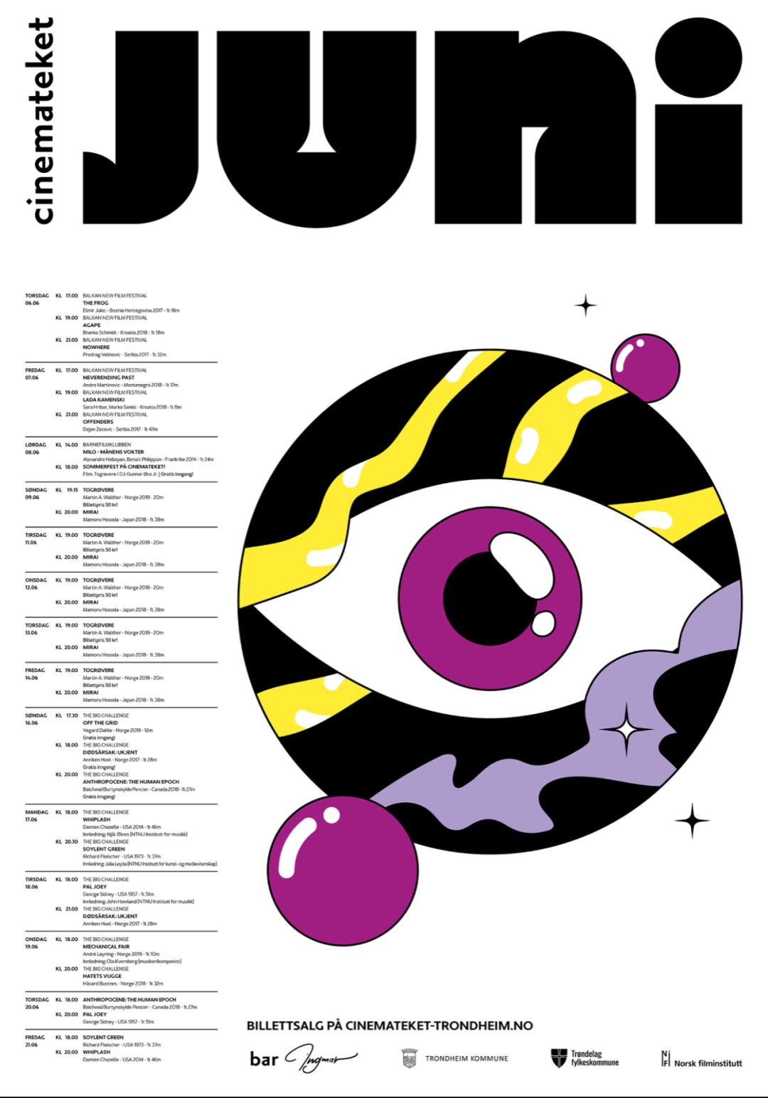 丹麦一家叫做Hugmun的设计工作室,为一家名为Cinemateket Trondheim的电影院,设计了一年的月度计划系列海报。设计师用简洁、抽象的插画来表现与电影相关的内容,每一张海报都有着丰富、艳丽的色彩,标题字体根据不同插画的气质而做出变化。另外,大部分海报都有眼睛元素,旨在传递沉浸式观影和穿越时空的体验。